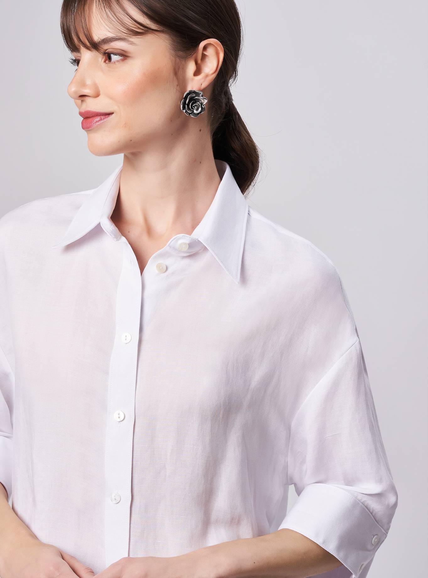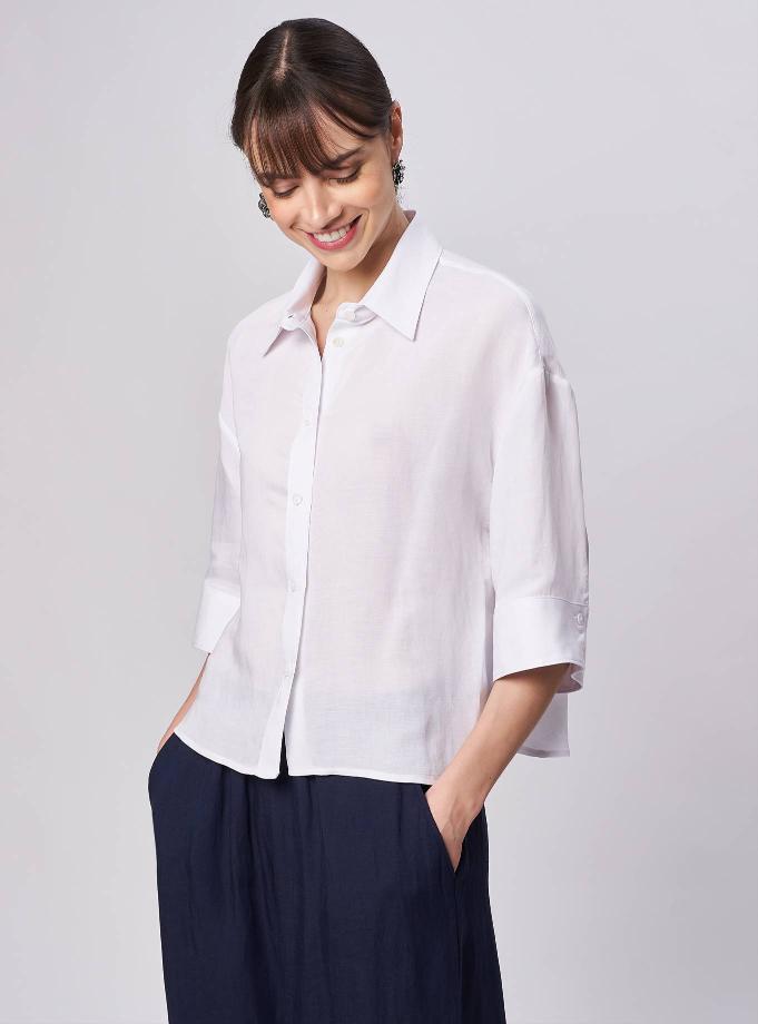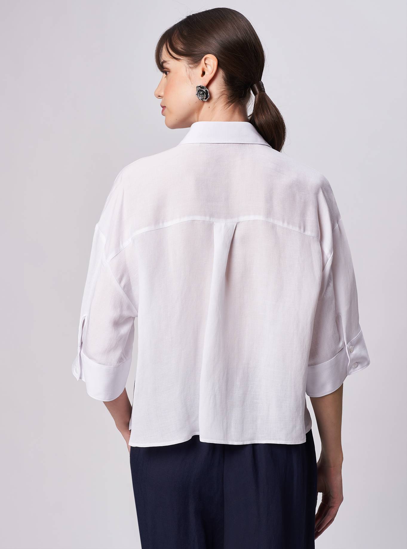 Oversized blouse, rounded slit at the bottom. "V" neck with round round Korean strap. Dropped shoulder with short kimono sleeves with turned edge detail. Single fold detail on the front center to give volume. Side length.