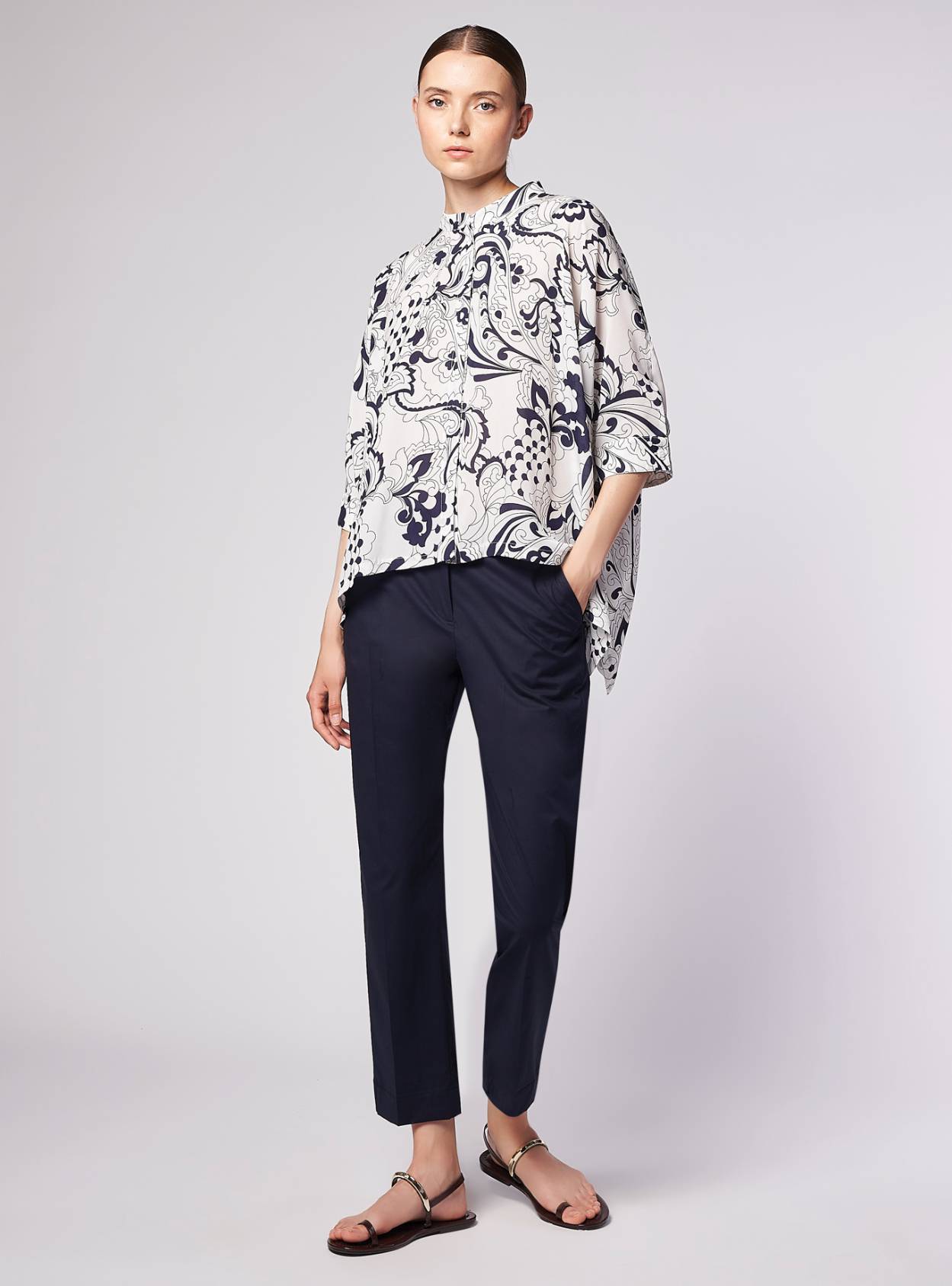 Soft fit shirt, round neckline with edge and patch pockets with cuff on the front. Long regular sleeve with one-button cuff. Cut carrè behind with counterfold.
