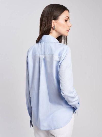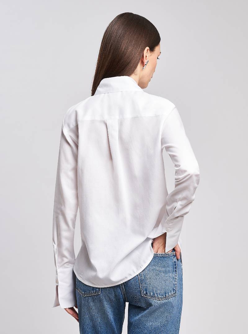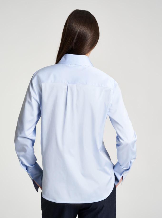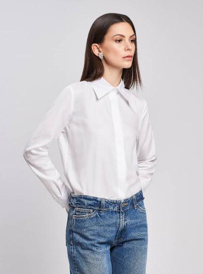 Loose fit shirt. Important shirt collar. Regular sleeve with high cuff closed by two buttons that flares towards the bottom. Concealed buttoning. Yoke on the back with cannon. Medium hip length, rounded hem.