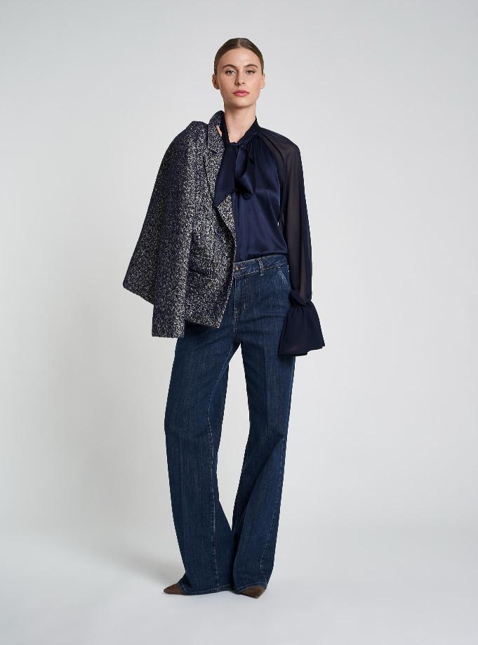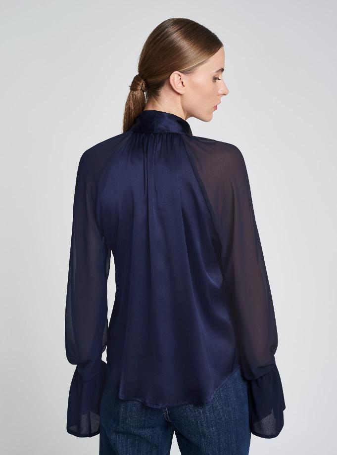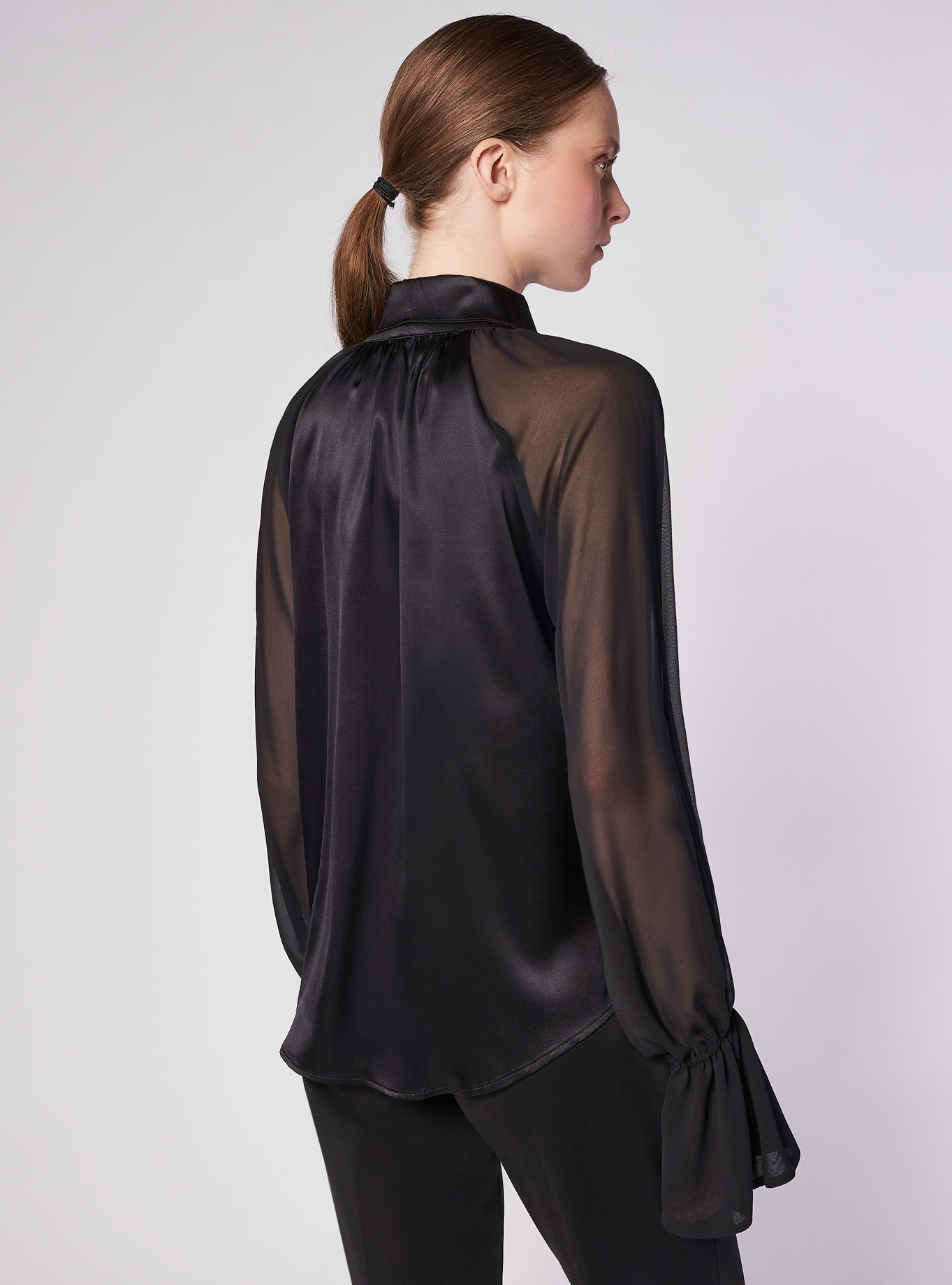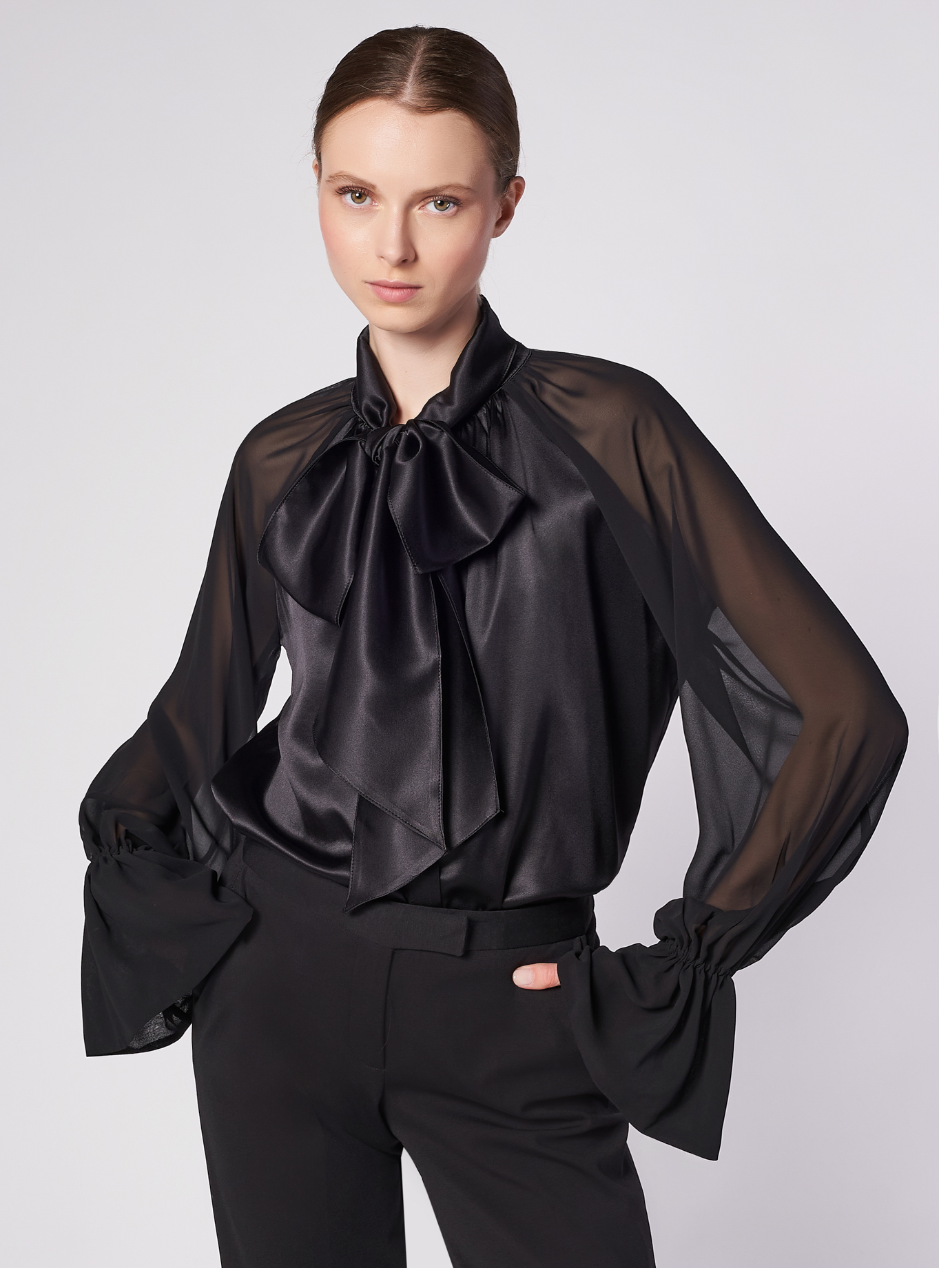 Loose fit shirt. Collar with adjustable bow. Raglan sleeves, with elastic at the wrist and feminine ruffles at the bottom. Concealed buttoning. Slightly rounded hem, low hip length. Sleeves in matching transparent fabric.