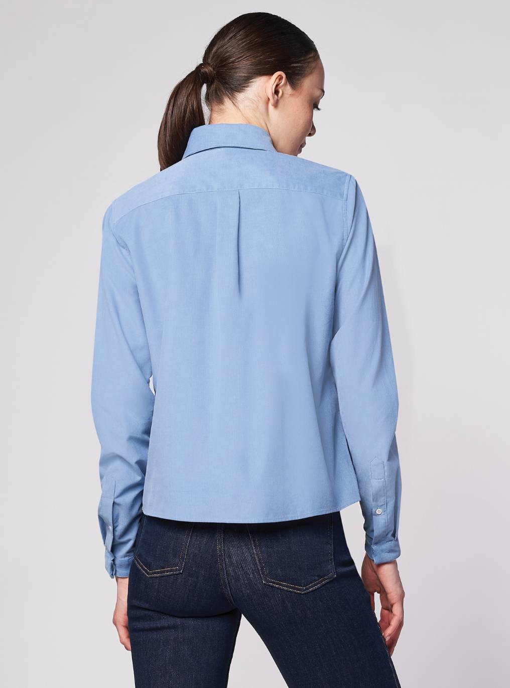 Regular fit shirt, straight fit. Shirt collar. Slightly dropped shoulder, regular sleeves, low cuff with hidden button. Breast pocket on the left side. Back yoke with cannon. Even hem. Medium-high sidewall length.