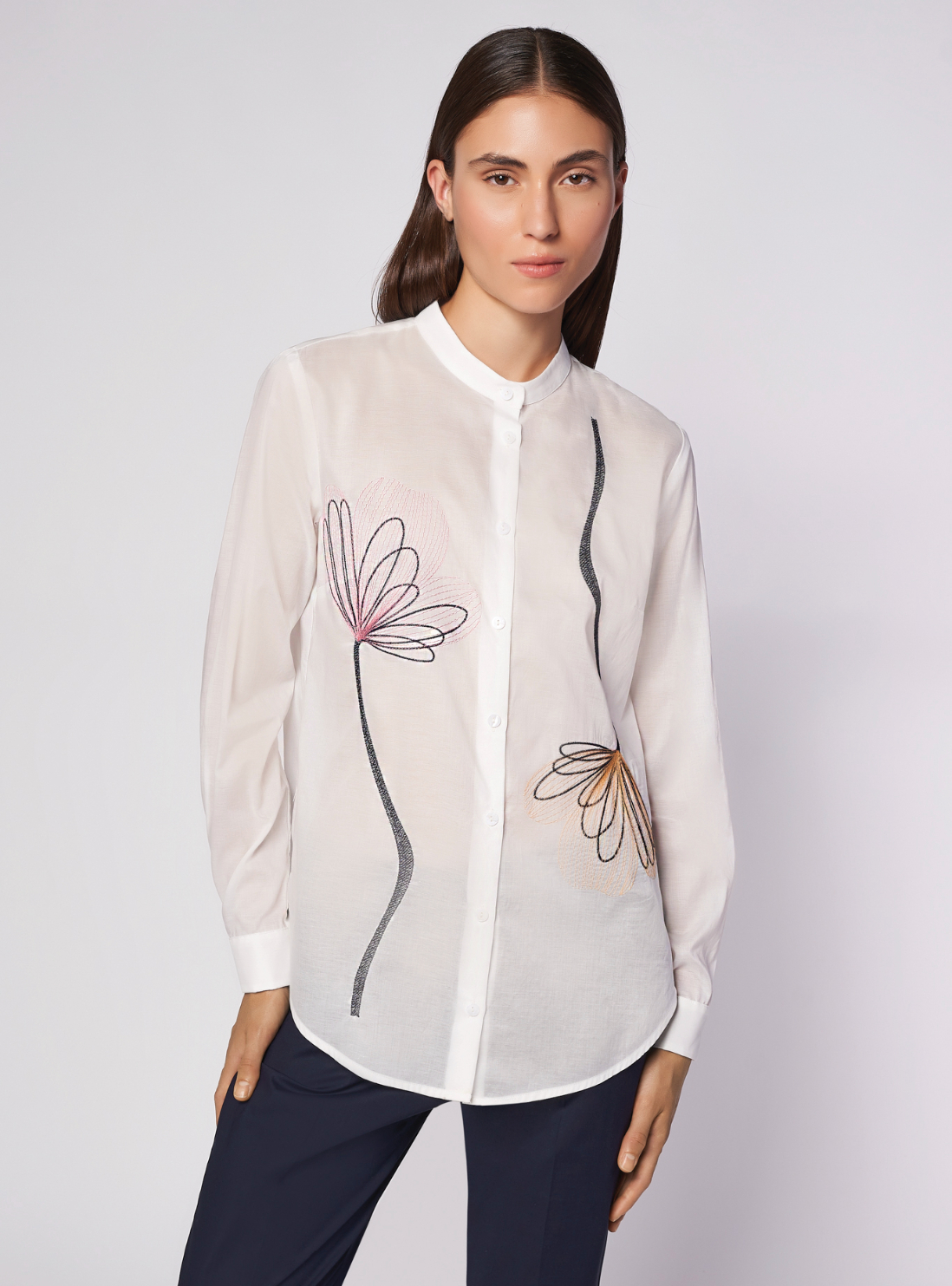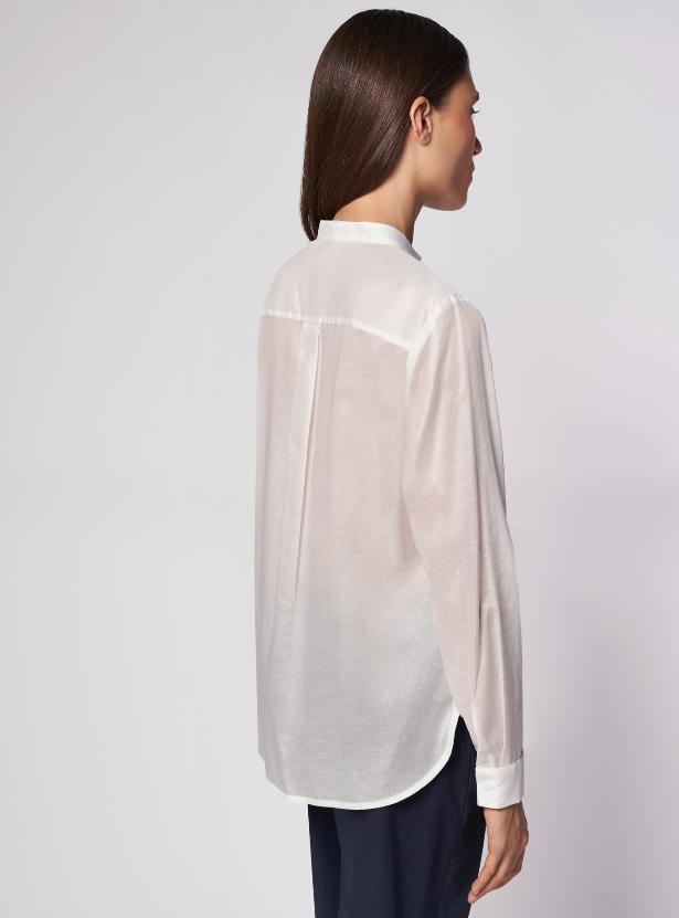 Regular-fit shirt with mandarin collar. Carré cut at the back with a placket that adds volume to the garment.