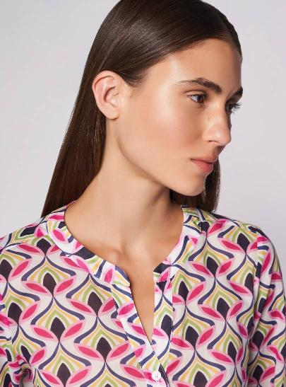 Soft fit shirt. "V" neck with round round Korean strap. Shoulder and regular sleeve, 3/4 short with cuff one button. Carrè behind with counterfold. High flank length.