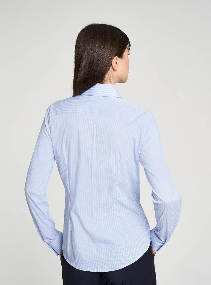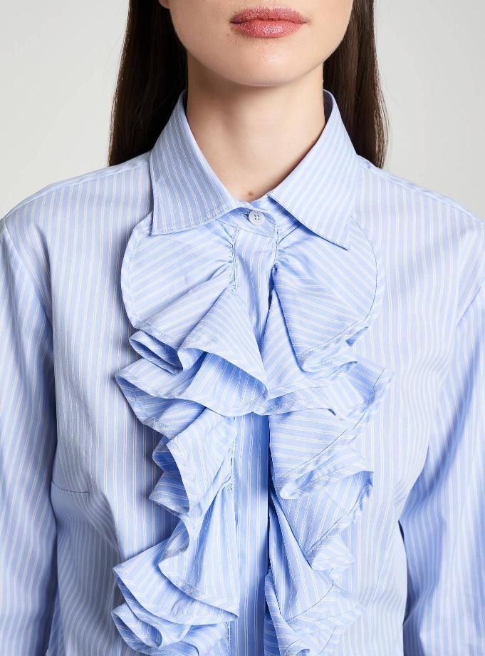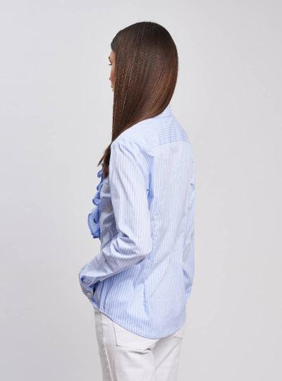 Close-fitting shirt. Shirt collar. Concealed buttoning. Detail of rich ruffles on the front with bias trim in the same fabric as the shirt. Regular sleeve with two-button cuff. Front and back pleats. Corner behind. Medium-short shirt, medium-high hip length.