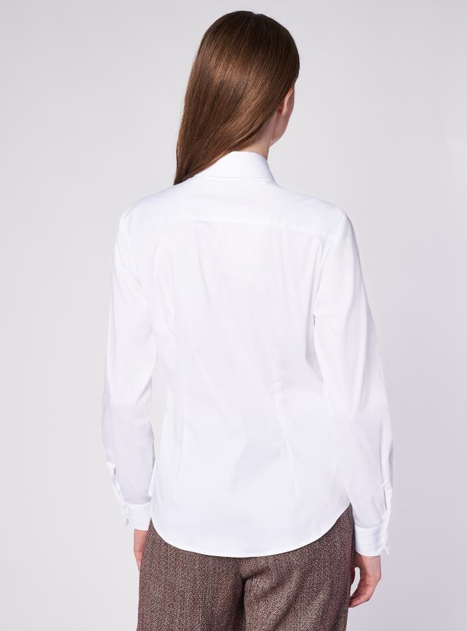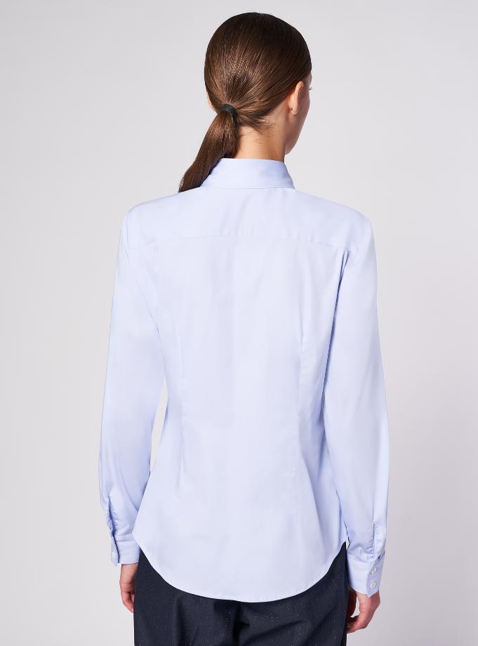 Slim fit shirt. Shirt collar. Regular sleeves with two-button cuff. Pleats front and back- Yoke at the back. Medium-short shirt, medium-high hip length.