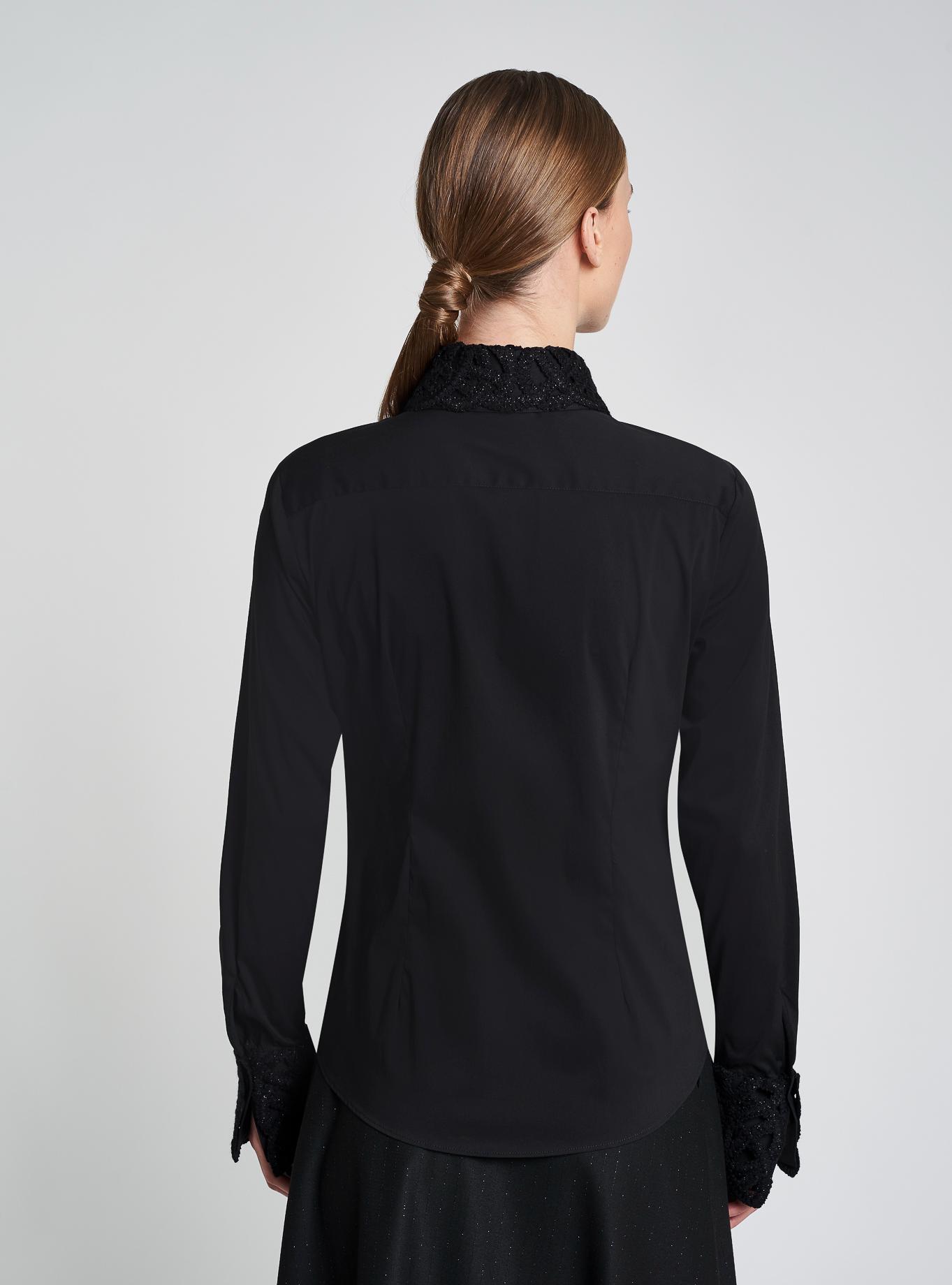 Close-fitting shirt. Shirt collar. Regular shoulder. Concealed buttoning. High cuff that flares at the bottom. Darts front and back. Yoke on the back. Medium-short shirt, medium-high hip length. Collar and cuffs with rich macramé embroidery with lurex.