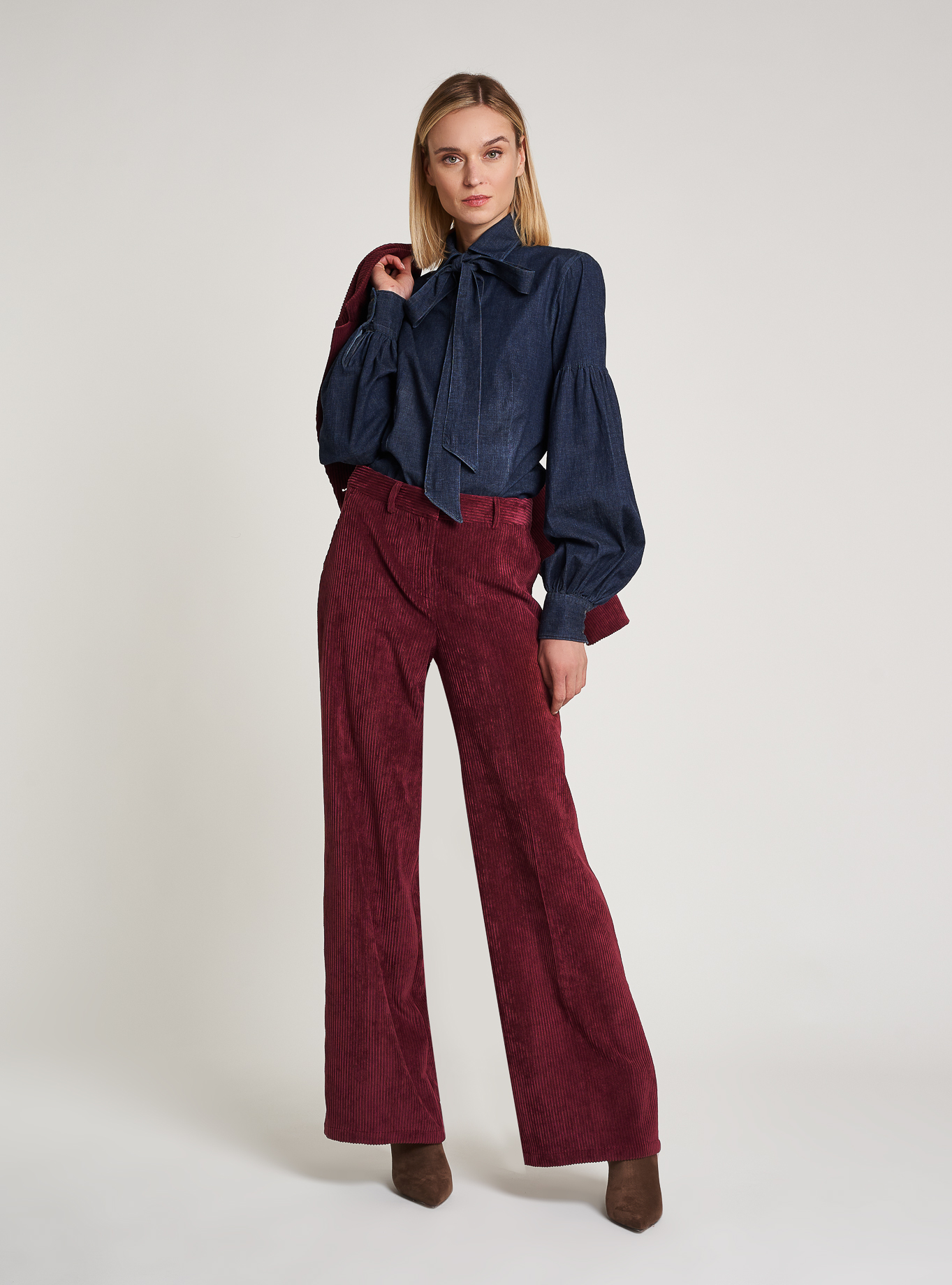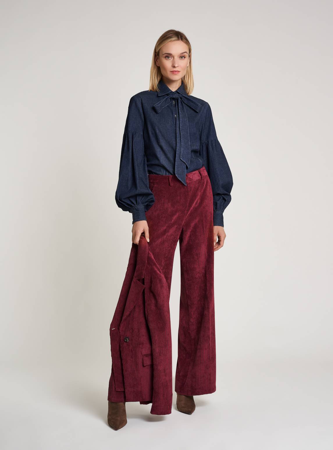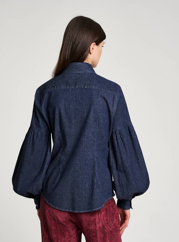 Close-fitting shirt. Shirt collar with detachable tie bow. Regular shoulder, feminine sleeve that widens to the wrist line creating a balloon effect. Cuff, with two buttons. Darts front and back. Yoke on the back. Medium-short shirt, medium-high hip length.