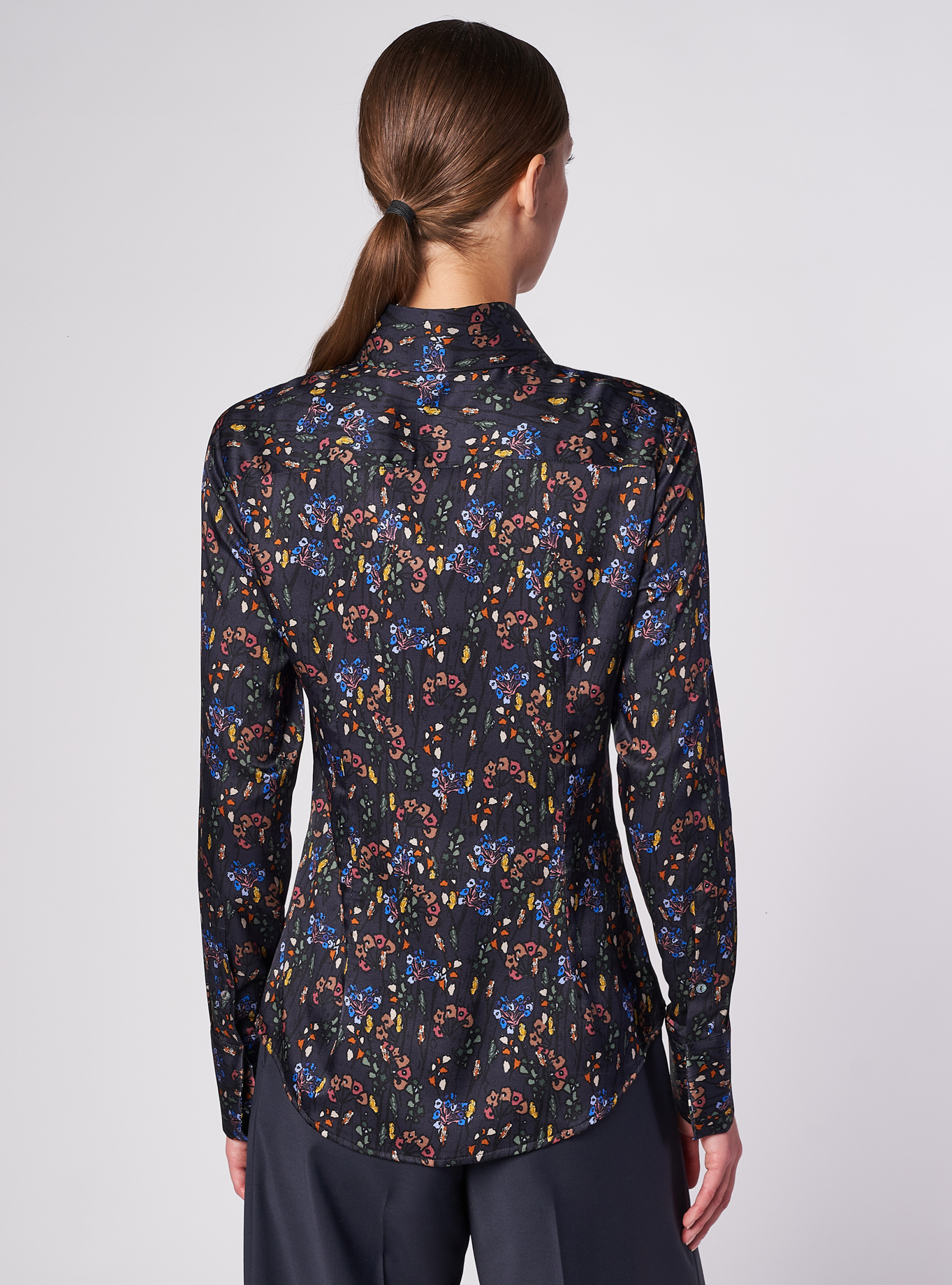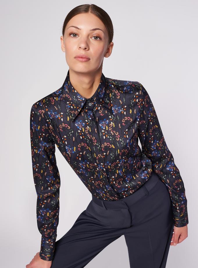 Close-fitting shirt. Shirt collar, high strap with two buttons. Concealed buttoning. Regular sleeve with high cuff and two hidden buttons. Front and back pleats. Corner behind. Medium-short shirt, medium-high hip length.