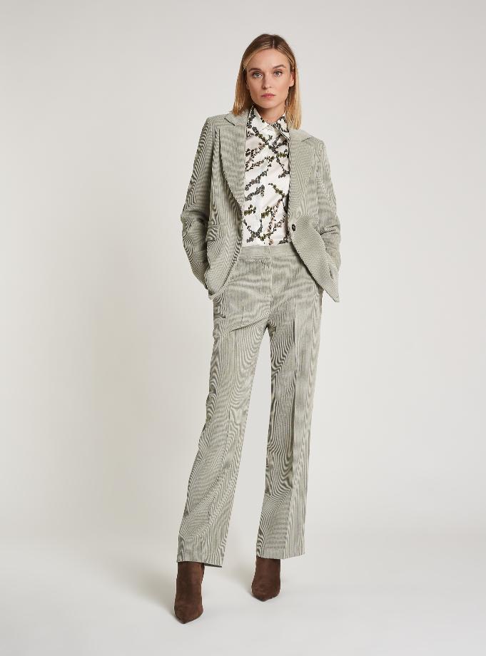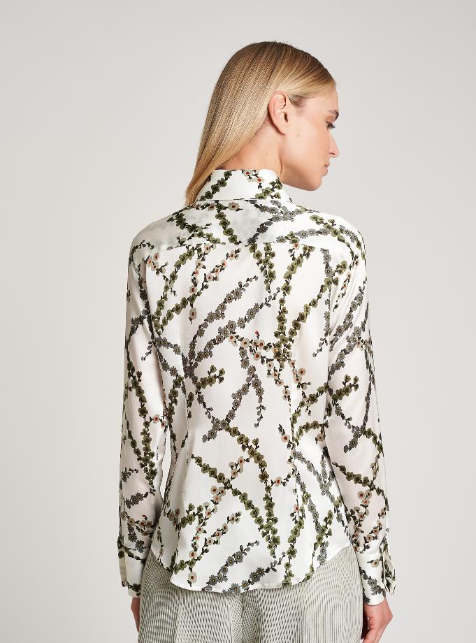 Close-fitting shirt. Shirt collar, high strap with two buttons. Concealed buttoning. Regular sleeve with high cuff and two hidden buttons. Front and back pleats. Corner behind. Medium-short shirt, medium-high hip length.