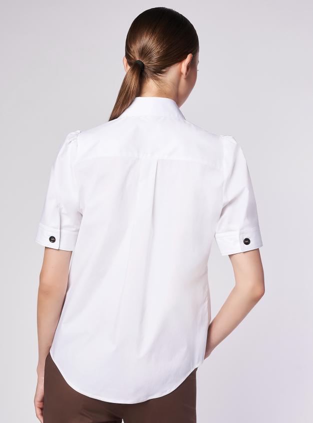 Slim-fit shirt. Shirt collar, regular shoulder, short sleeves with slight gathers at the cuff. Contrasting button fastening at the front and wide placket with visible stitching. Rounded hem. High hip length.