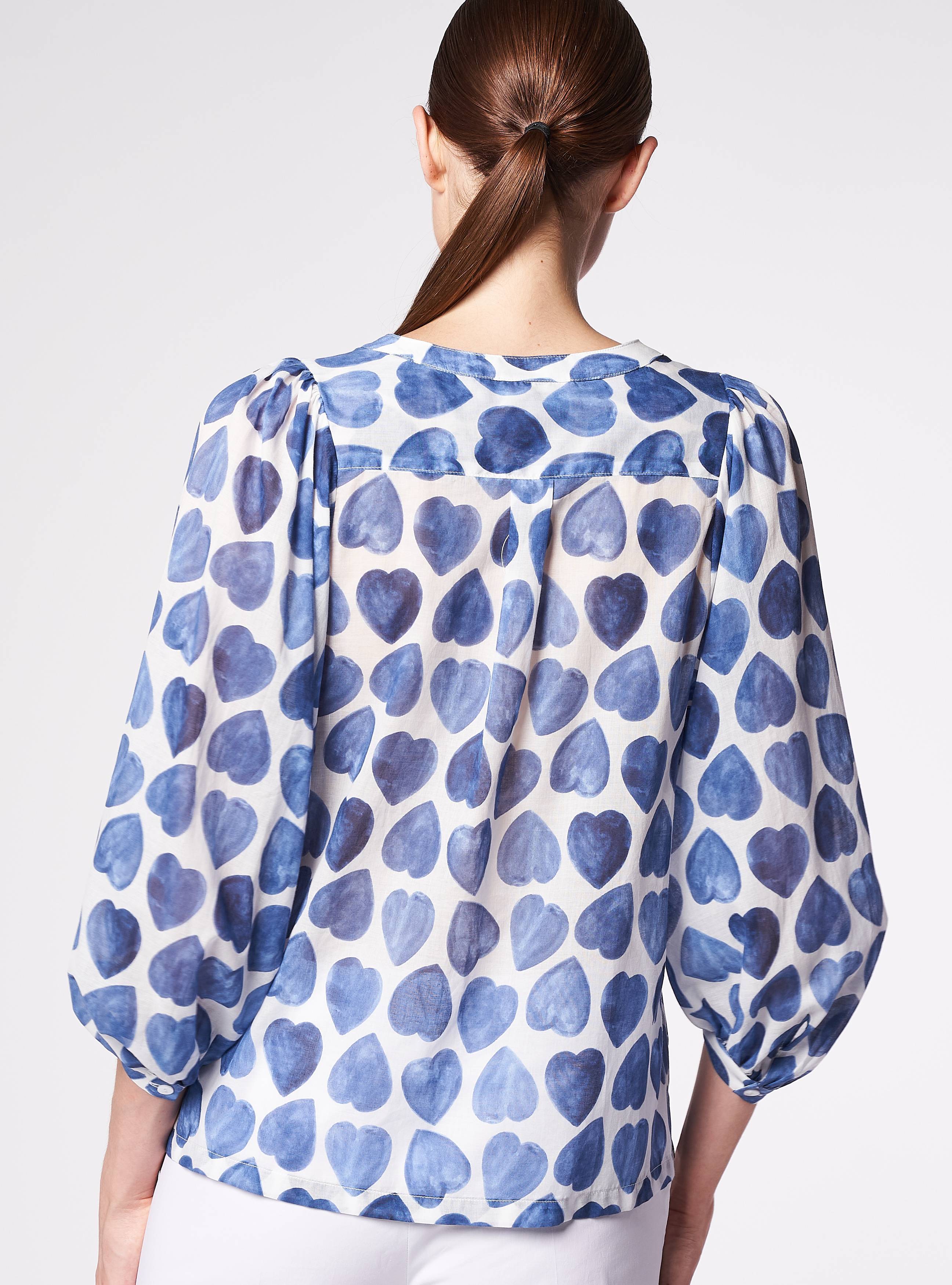 Regular-fit shirt. V-neck with flat round mandarin collar. Slightly gathered shoulders and wide, short 3/4-length puff sleeves with low, single-button cuffs. Back yoke with pleat. Hip length.