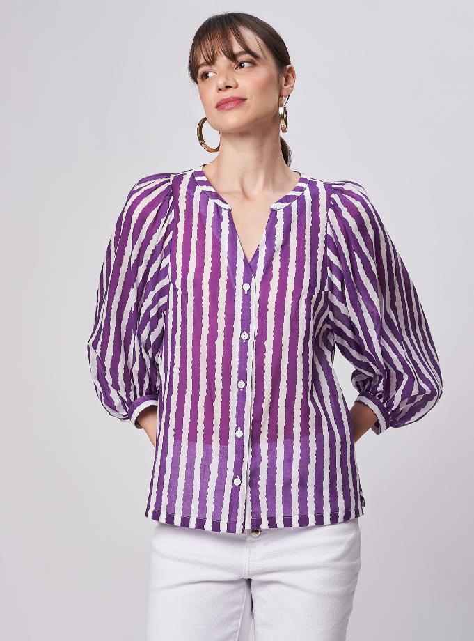 Regular-fit shirt. V-neck with flat round mandarin collar. Slightly gathered shoulders and wide, short 3/4-length puff sleeves with low, single-button cuffs. Back yoke with pleat. Hip length.
