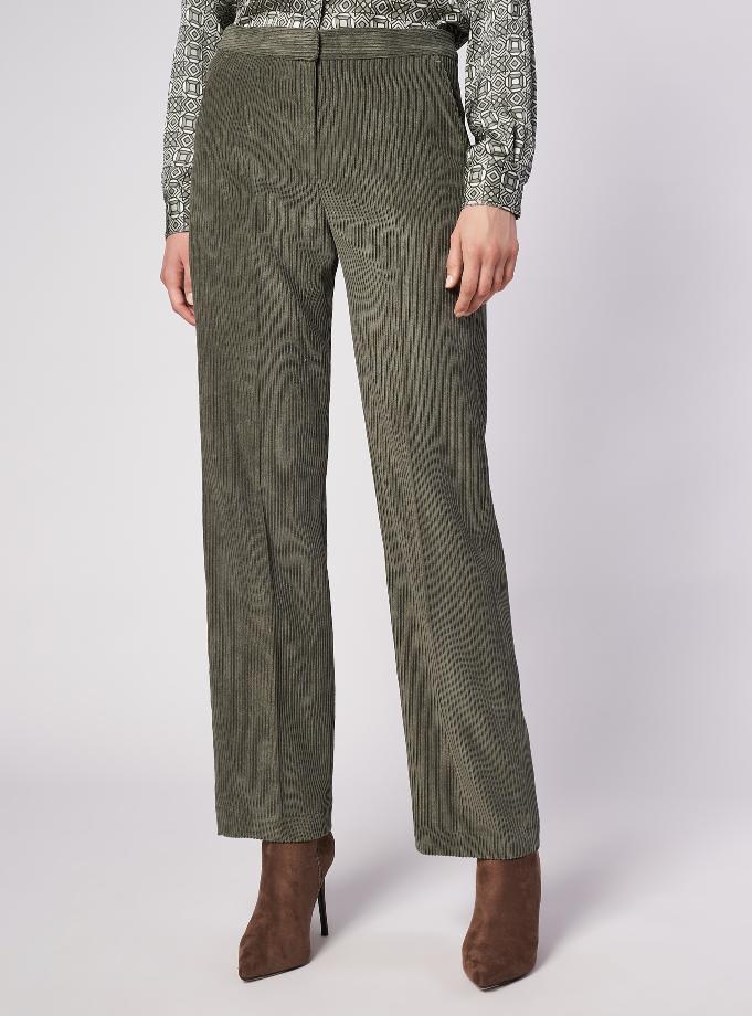 Regular fit trousers with straight leg. Flat waistband on the front and elastic detail inserted in the center back to give greater comfort and to perfect the fit of the waistline. Regular waist/hip slightly dropped. French pockets on the front. Zip opening on the center front, hook and internal button in the waistband. Length below the ankle.