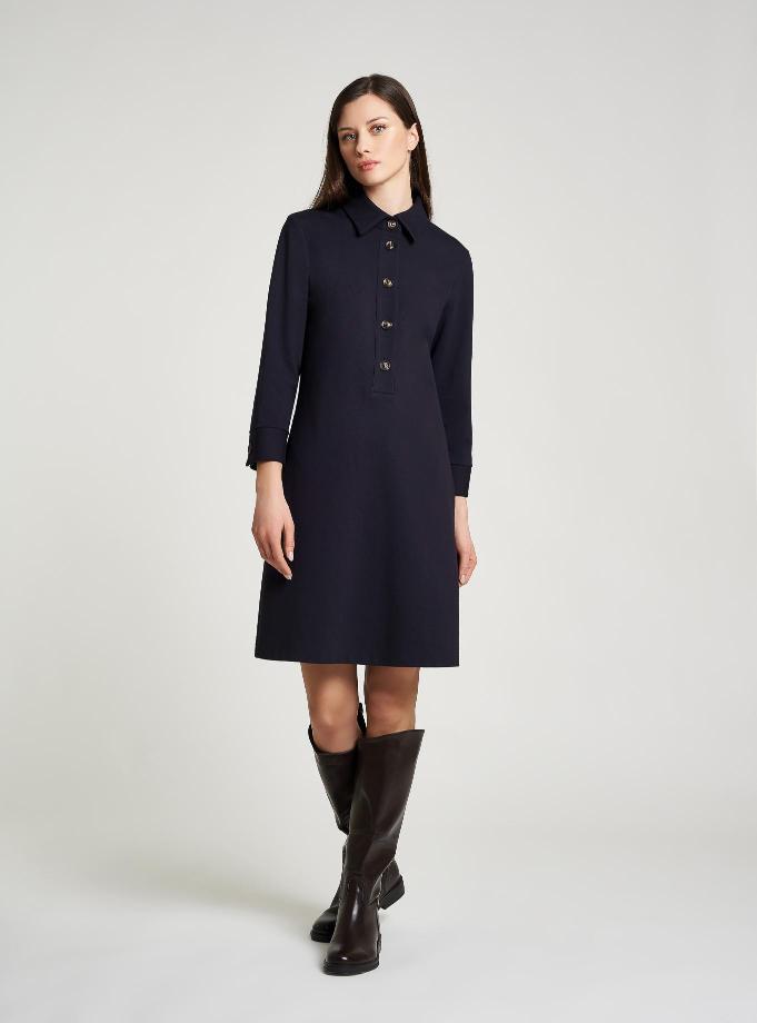 Abito vestibilità regolare, lunghezza al ginocchio, leggermente svasato al fondo. Spalle regolari, collo a camicia, allacciatura a polo. Manica tre quarti con polso chiuso da bottone. Tasche inserite nel fianco.
