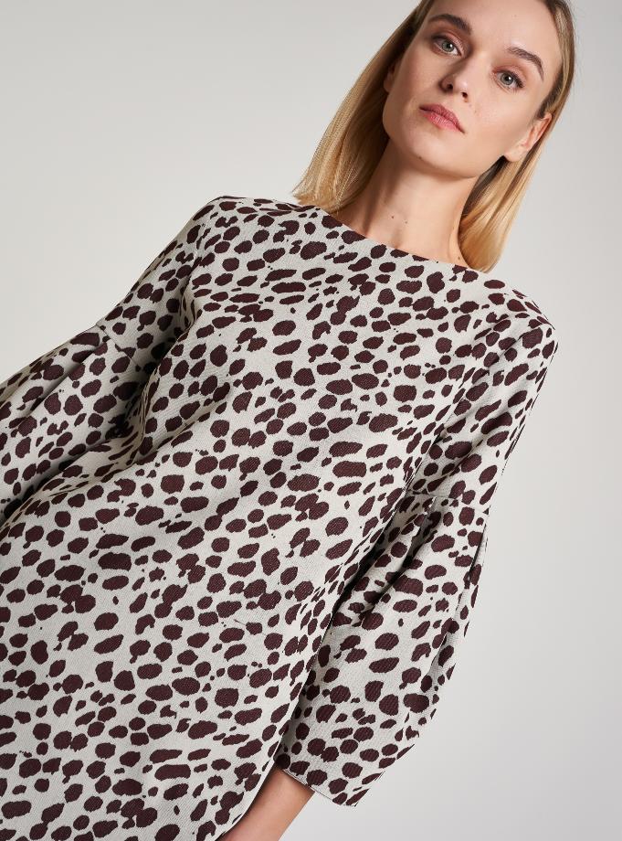 Abito con linea ad "A" lunghezza sopra al ginocchio, spalla regolare. Scollo a a barca. Manica a baloon, lunghezza tre quarti.