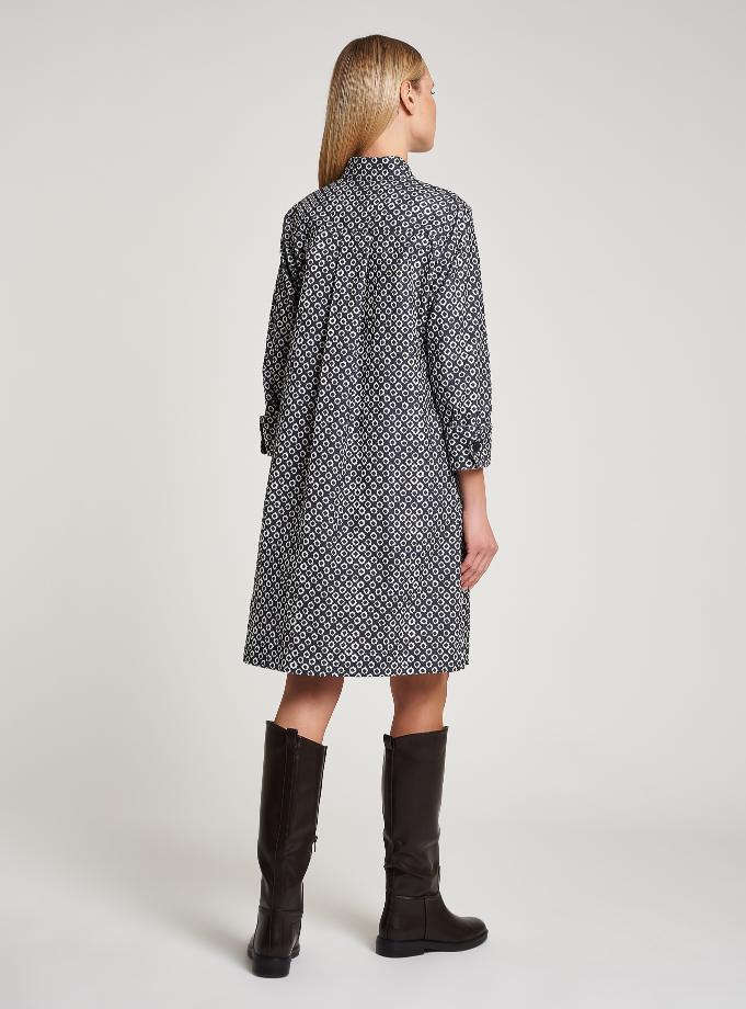 Abito corto, vestibilià regolare nella parte alta, svasa verso al fondo. Spalla regolare, manica lunga con polso e un bottone. Collo a camica, allacciatura a polo, dettaglio di taschino. Lunghezza la ginocchio. Capo foderato.