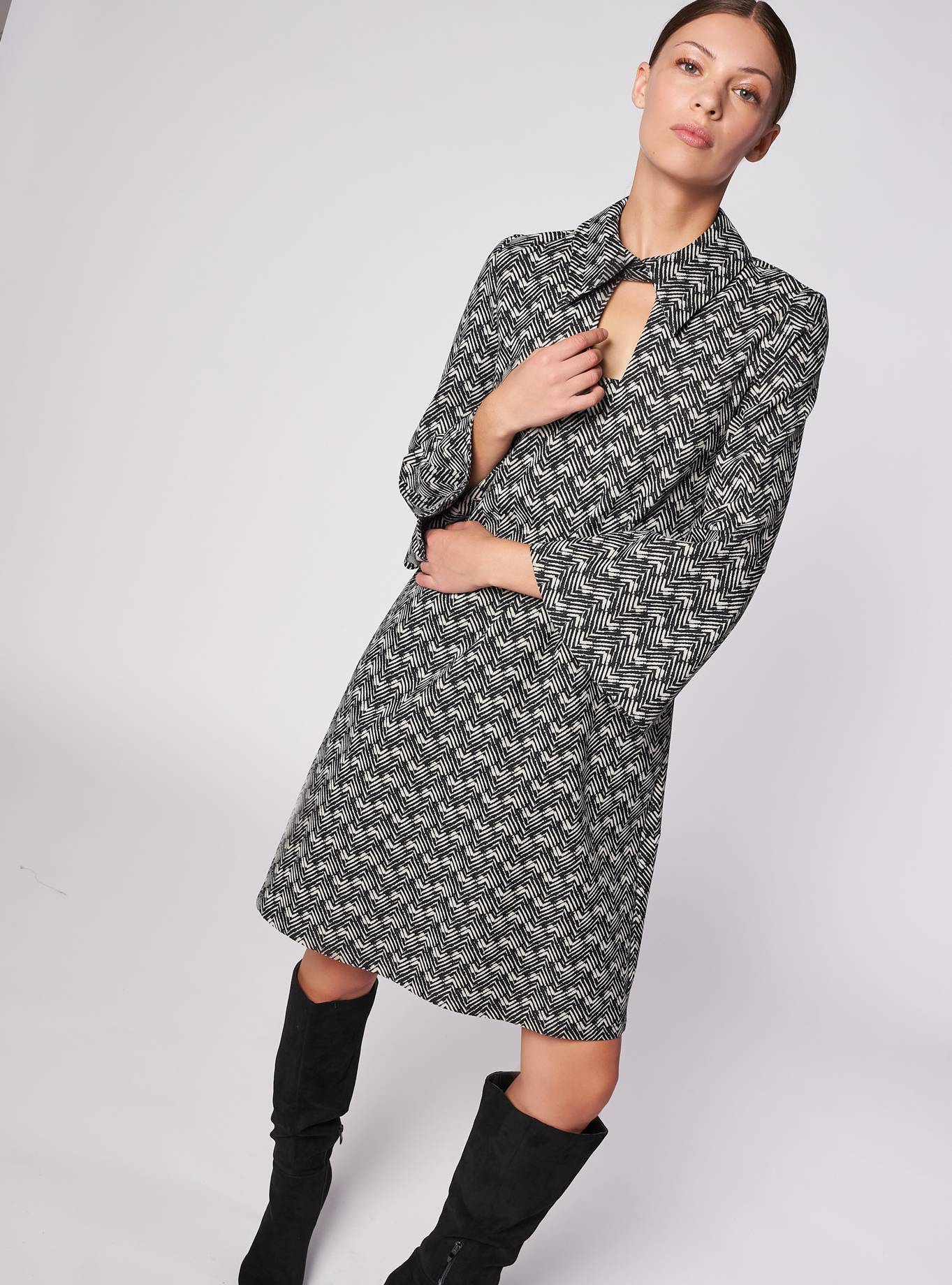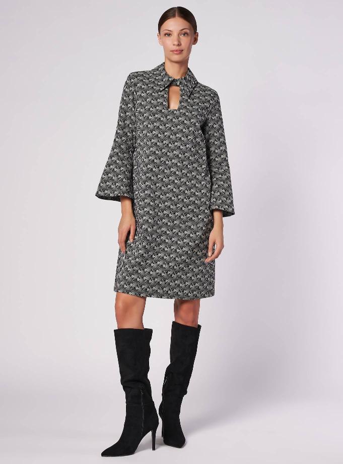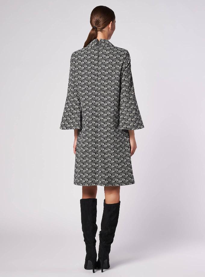 Abito con linea ad A, lunghezza sopra al ginocchio. Collo a camicia, goccia davanti, spalla regolare, manica lunga svasata al fondo.