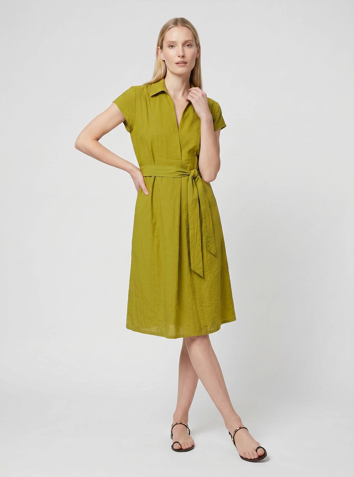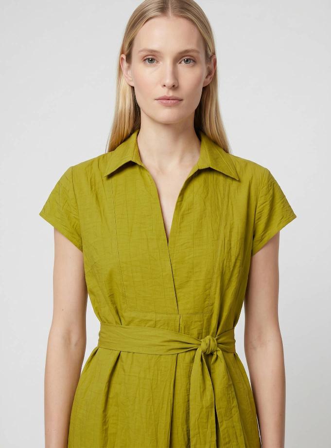 Abito linea ad "A", collo a camicia, maniche ad aletta. Scollo a "V", contropiego davanti. Cintura abbinata nello stesso tessuto da annodare in vita.