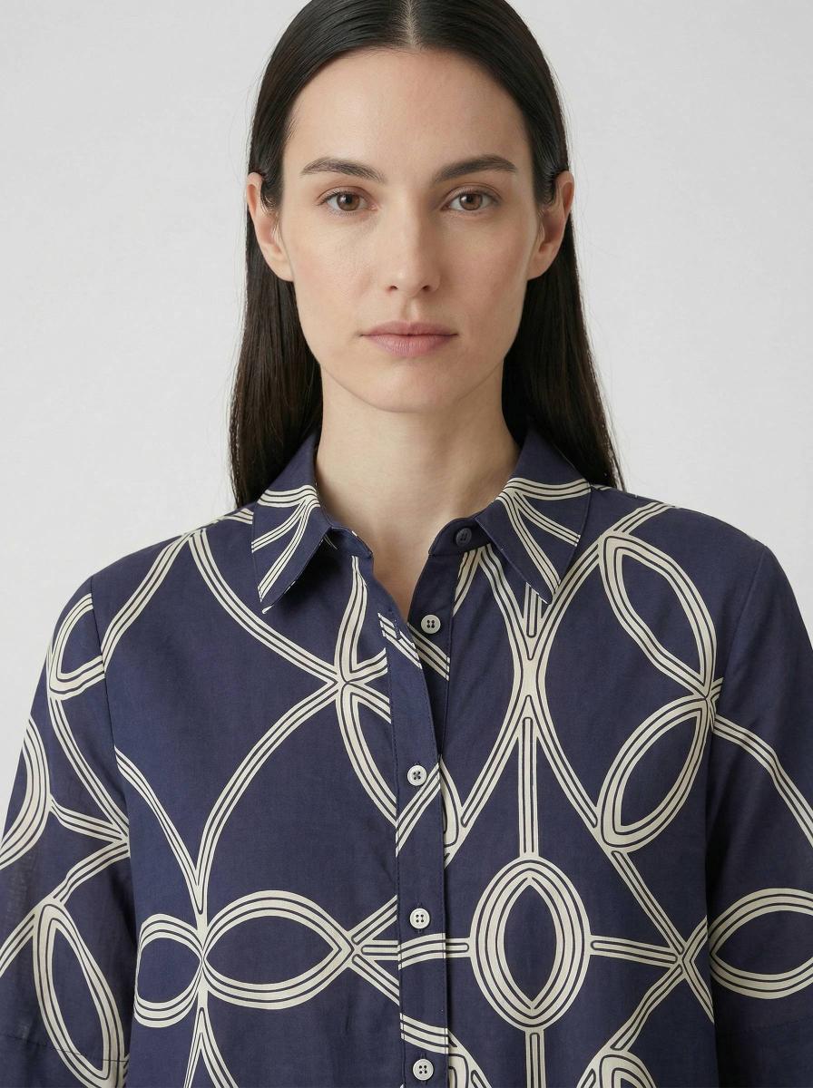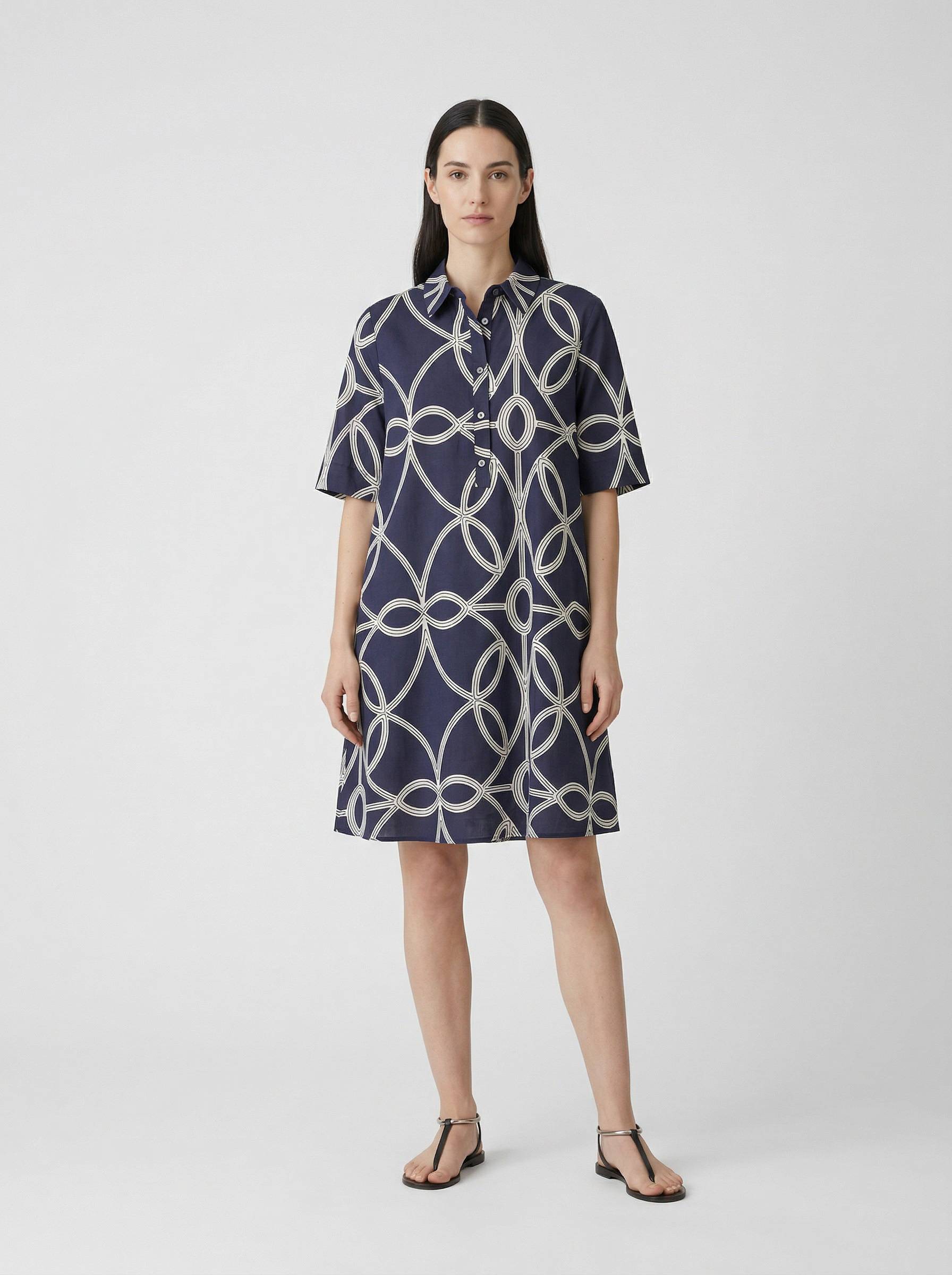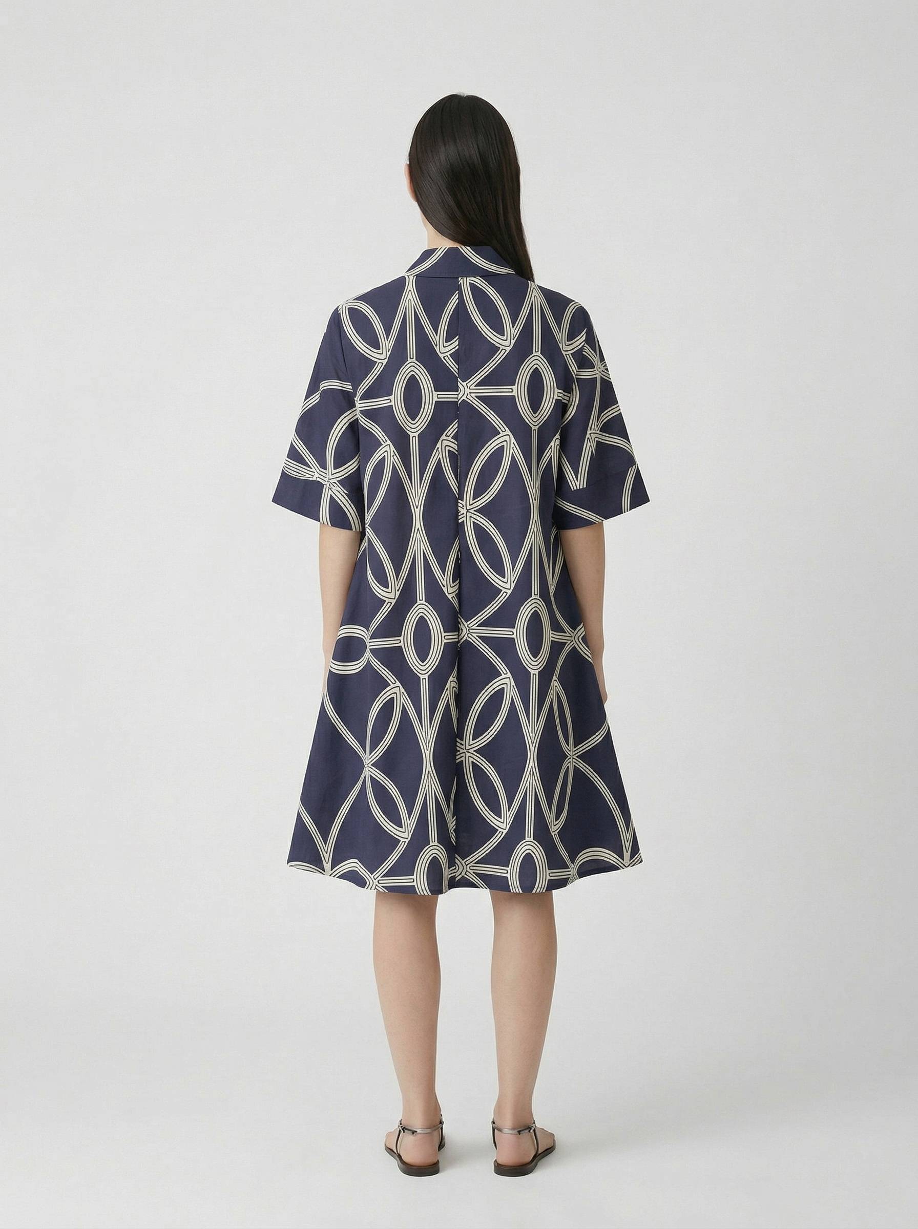 Abito linea ad "A", collo a camicia, maniche corte. Torace e spalle con vestibilità regolare, ampiamente svasato al fondo. Profondo contropiego dietro. Lunghezza al ginocchio.