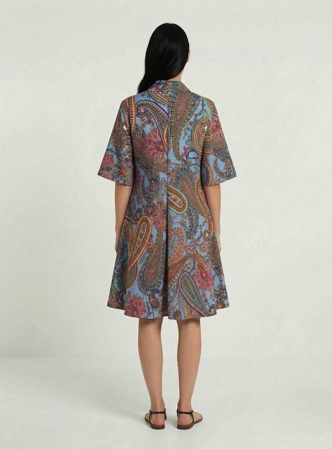 Abito linea ad "A", collo a camicia, maniche corte. Torace e spalle con vestibilità regolare, ampiamente svasato al fondo. Profondo contropiego dietro. Lunghezza al ginocchio.