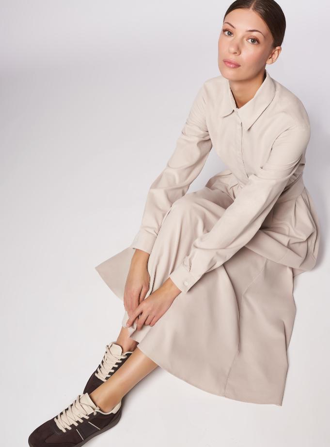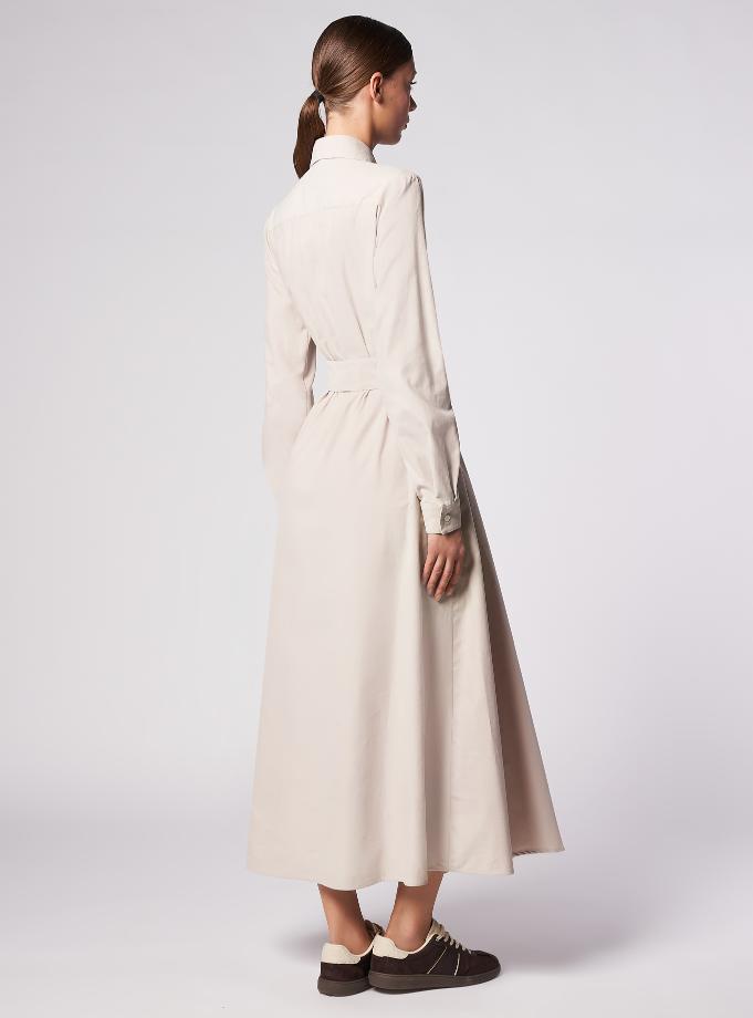 Abito semi chemisier, con ampia svasatura al fondo. Spalla regolare con manica leggermente a sbuffo, polso due bottoni. Cintura abbinata nello stesso tessuto per arricchire il look ed enfatizzare la silhouette. Fianchetti sul davanti. Tasche inserite nel fianco. Carrè sul dietro. Abito lungo.