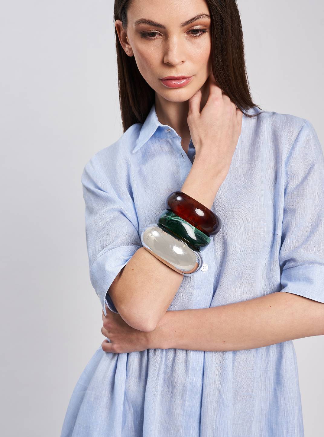 Abito lungo chemisier, vestibilità regolare che svasa leggermente al fondo. Dettaglio arricciatura nel taglio vita dietro.