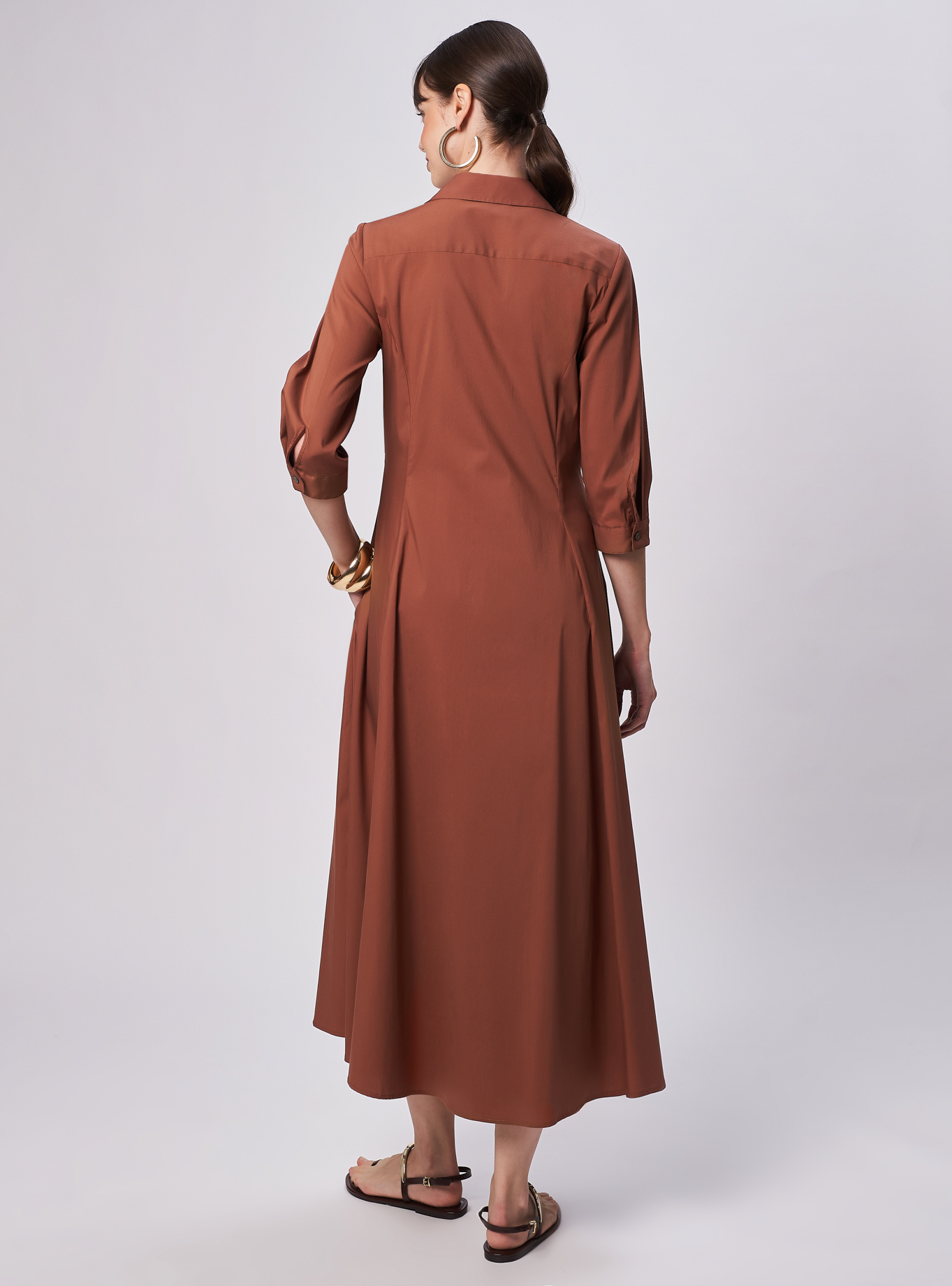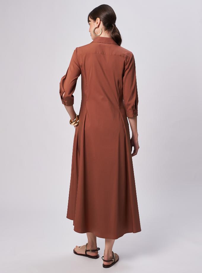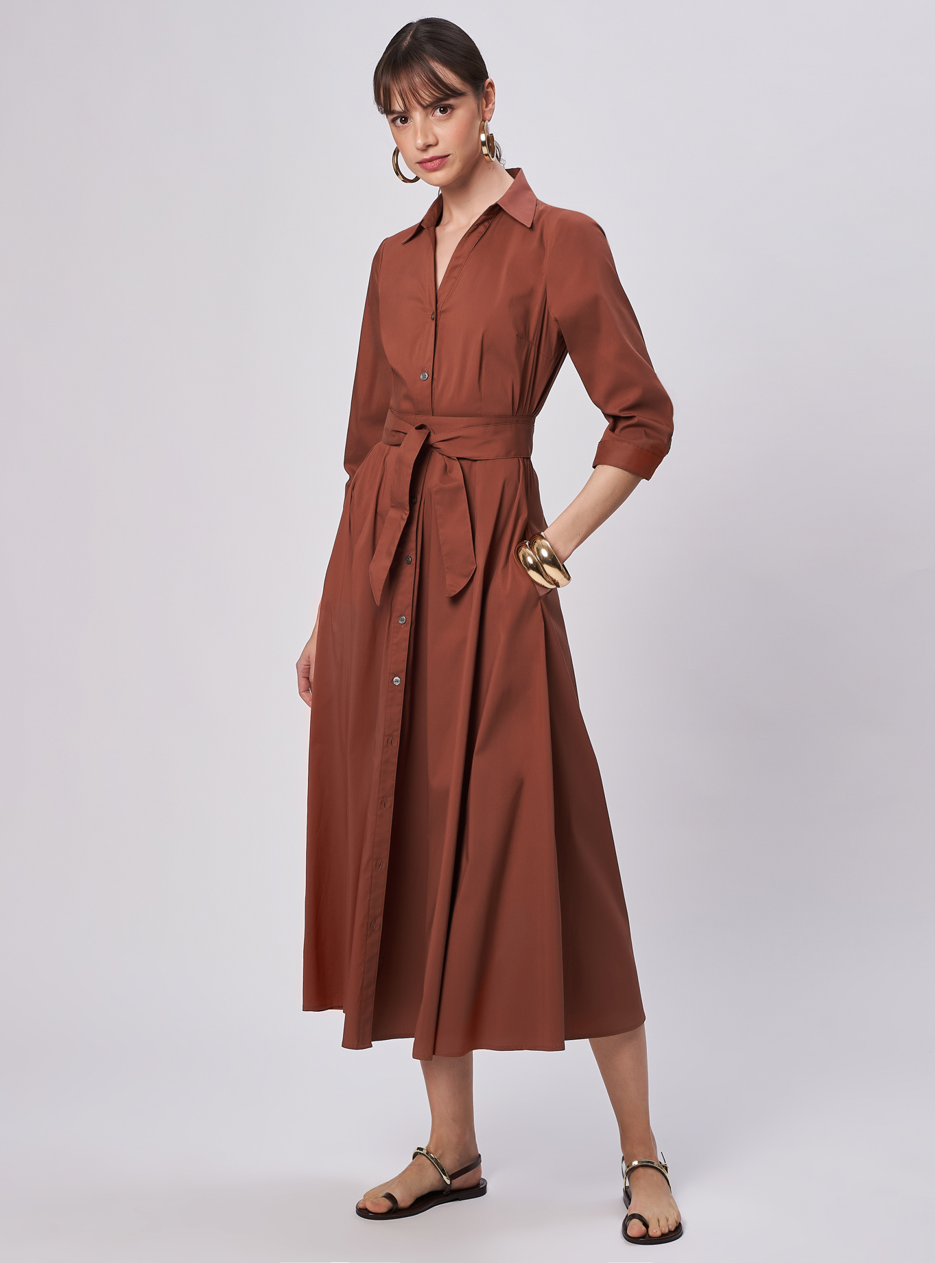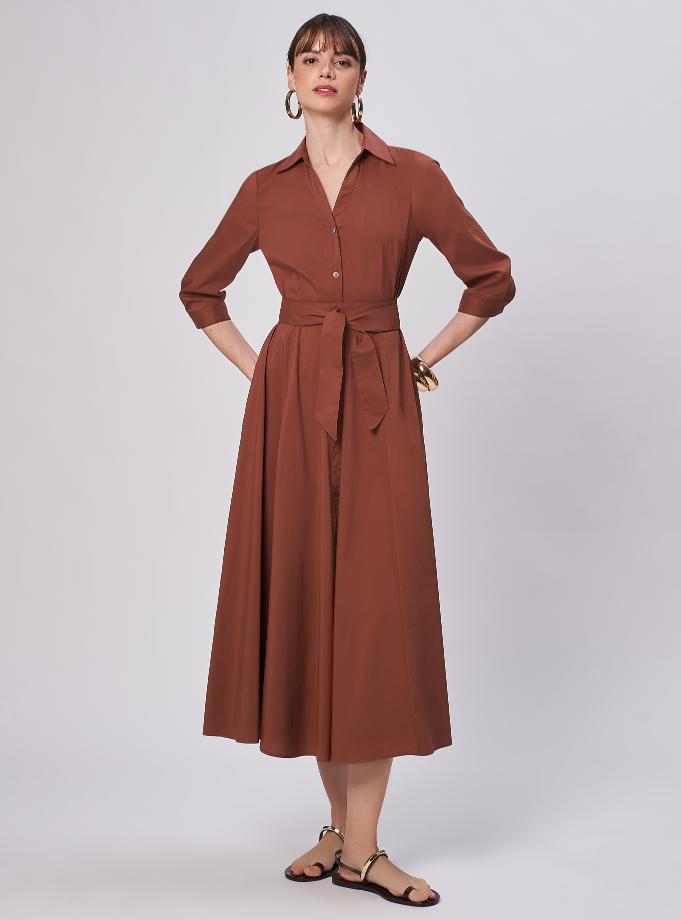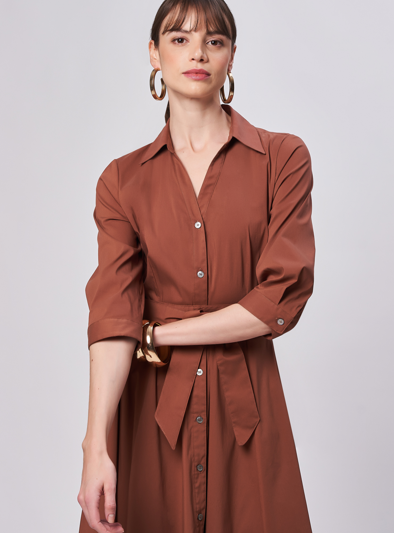 Abito lungo chemisier. Collo a camicia, scollatura a "V". Morbido in vita e ampio all'orlo, tagli verticali. Manica 3/4 corto con polsino un bottone. Abito lungo. Cintura nello stesso tessuto da annodare per sottolineare il punto vita.
