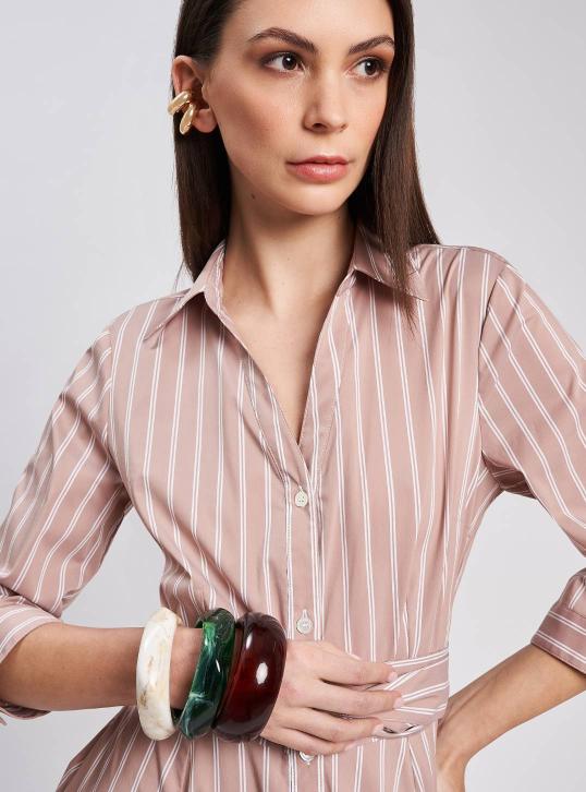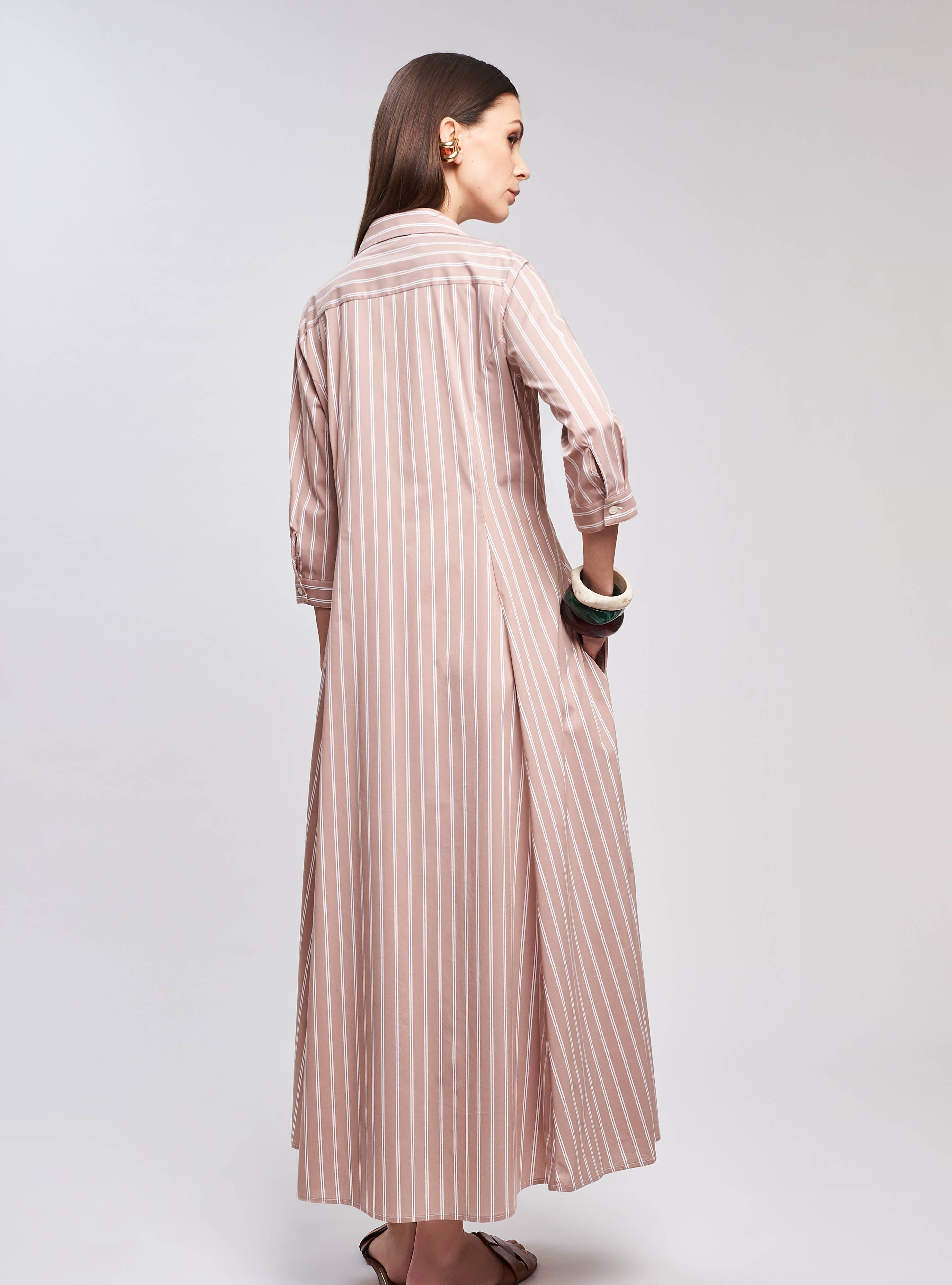 Abito lungo chemisier. Collo a camicia, scollatura a "V". Morbido in vita e ampio all'orlo, tagli verticali. Manica 3/4 corto con polsino un bottone. Abito lungo. Cintura nello stesso tessuto da annodare per sottolineare il punto vita.