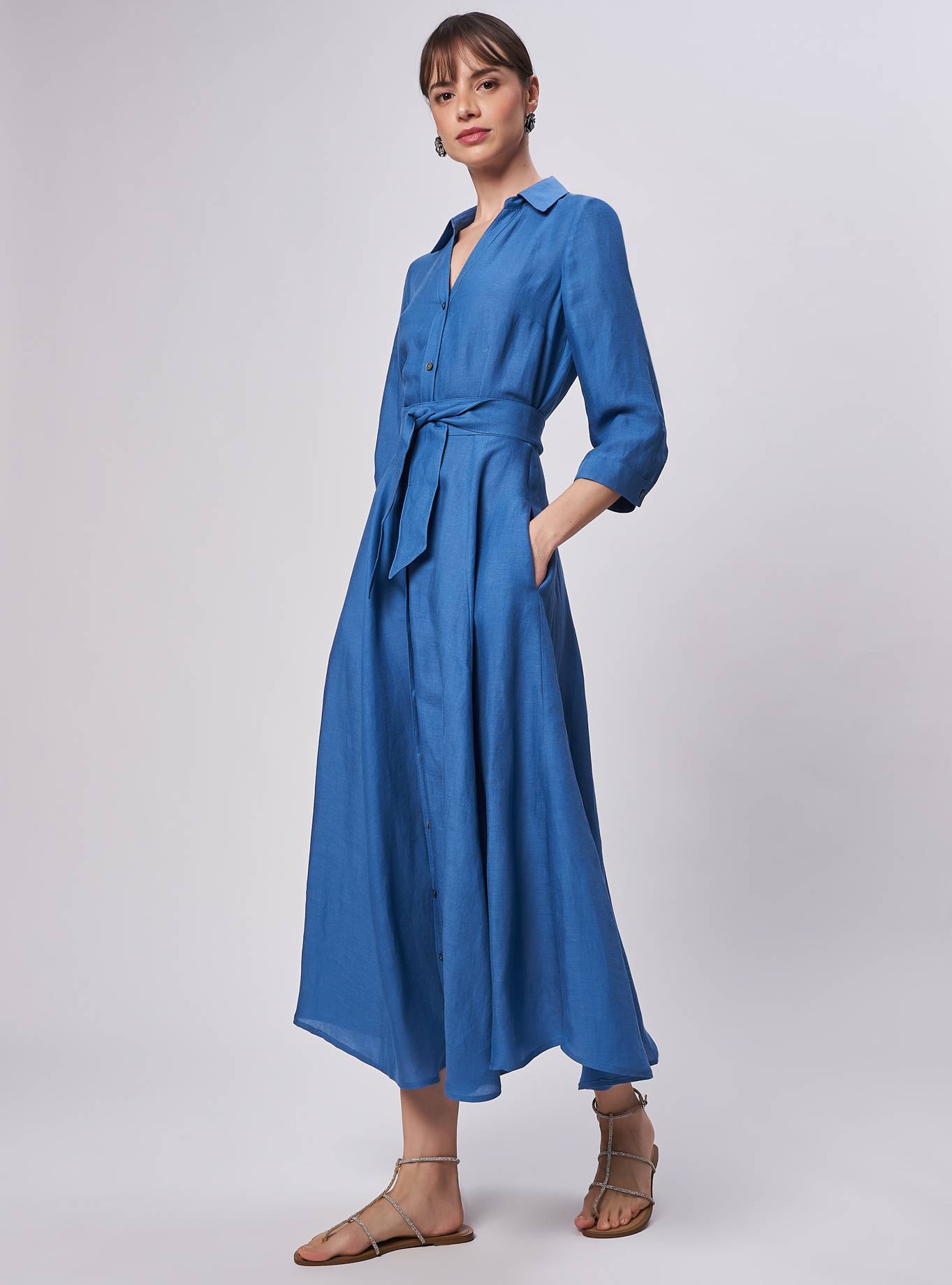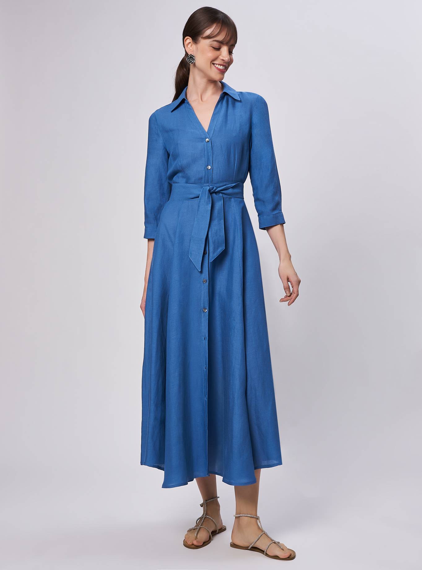 Abito lungo chemisier. Collo a camicia, scollatura a "V". Morbido in vita e ampio all'orlo, tagli verticali. Manica 3/4 corto con polsino un bottone. Abito lungo. Cintura nello stesso tessuto da annodare per sottolineare il punto vita.