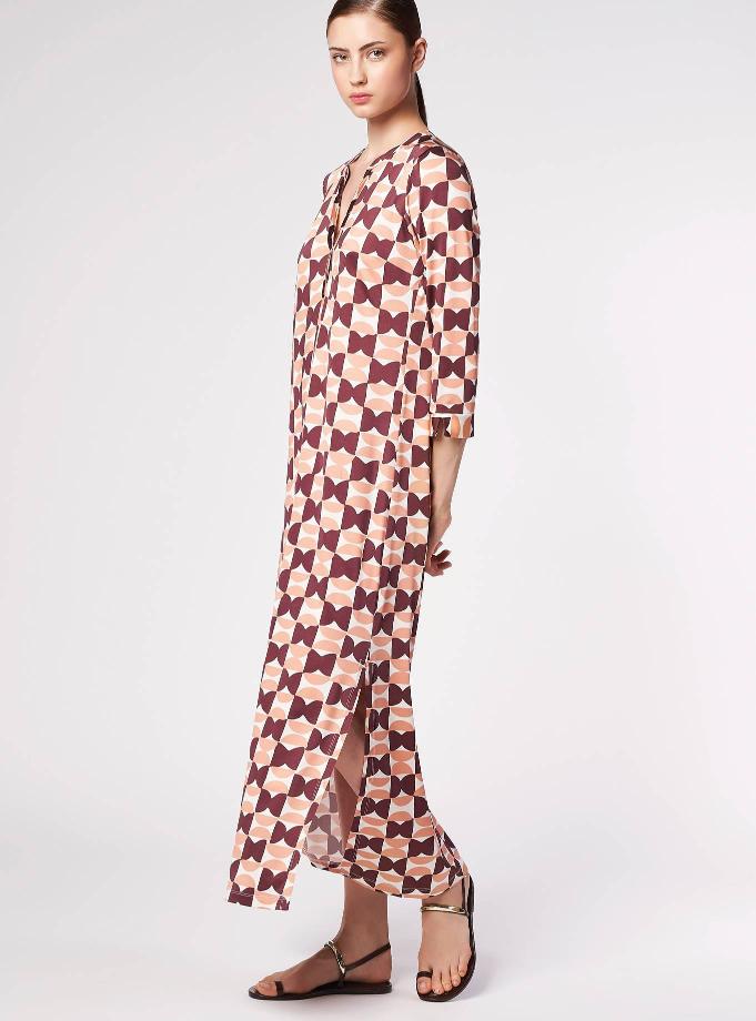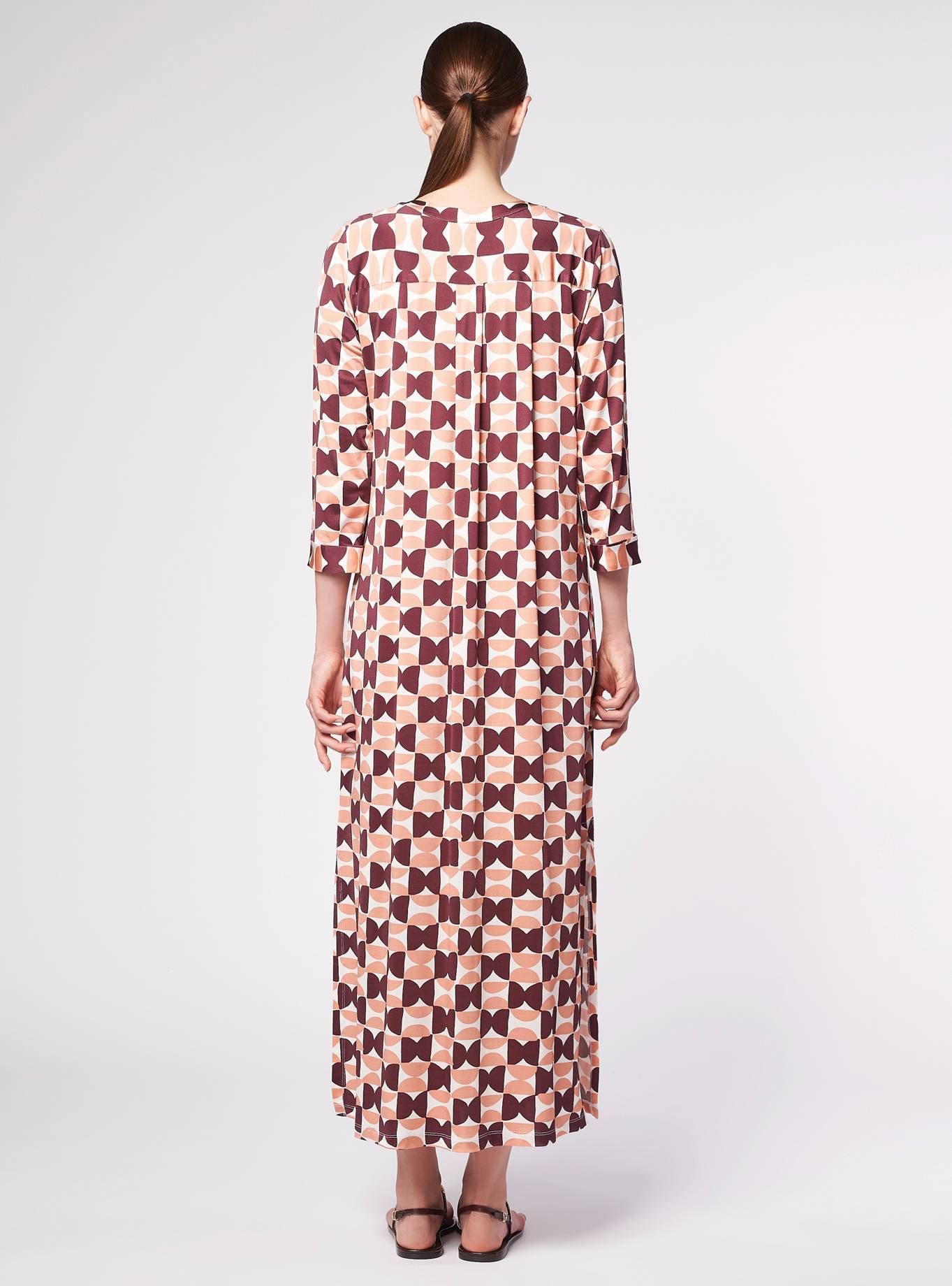 Abito lungo in jersey, scollo femminile. Maniche 3/4. Linea dritta, piega davanti per dare maggiore morbidezza. Spacchi laterali.