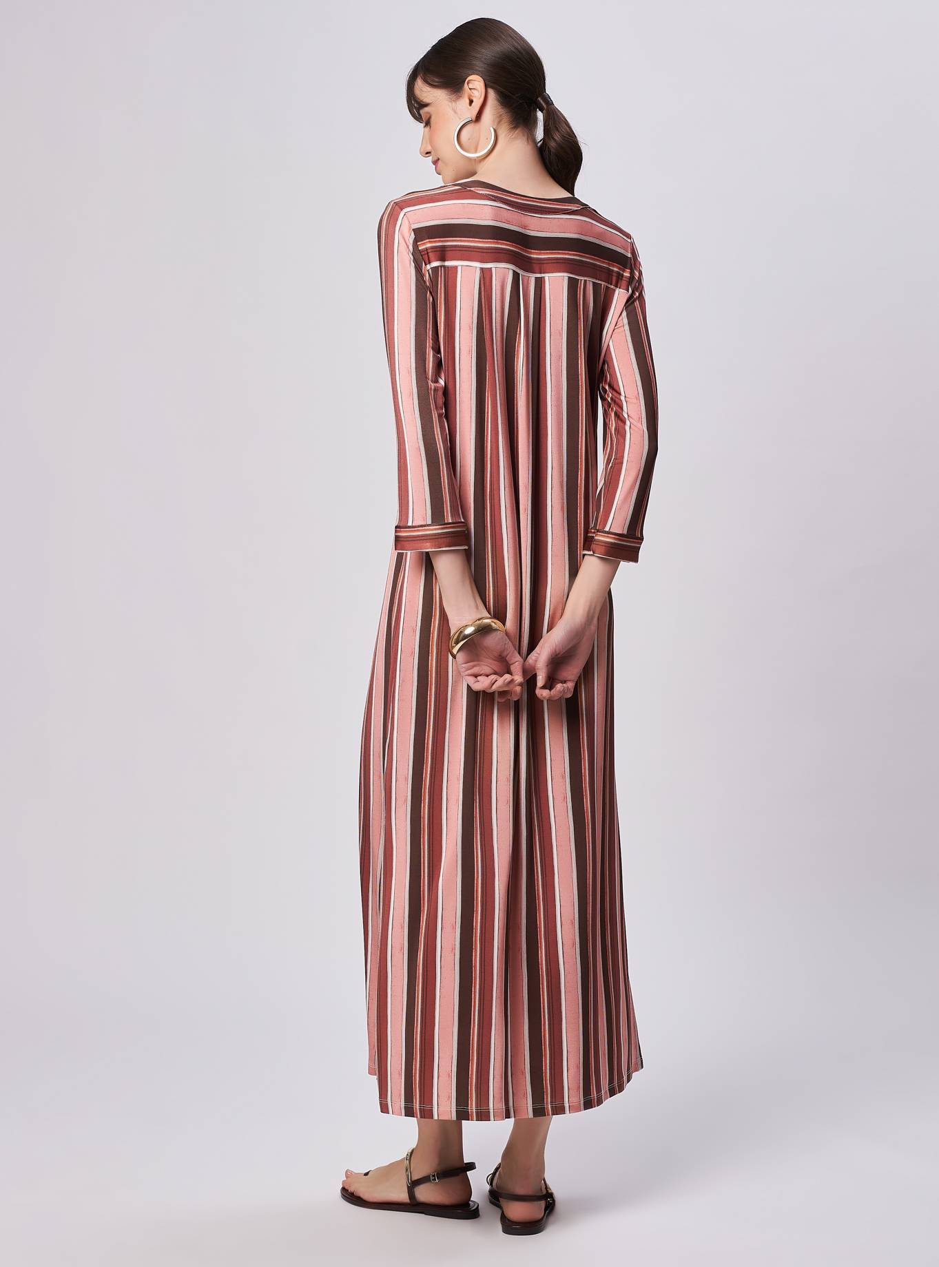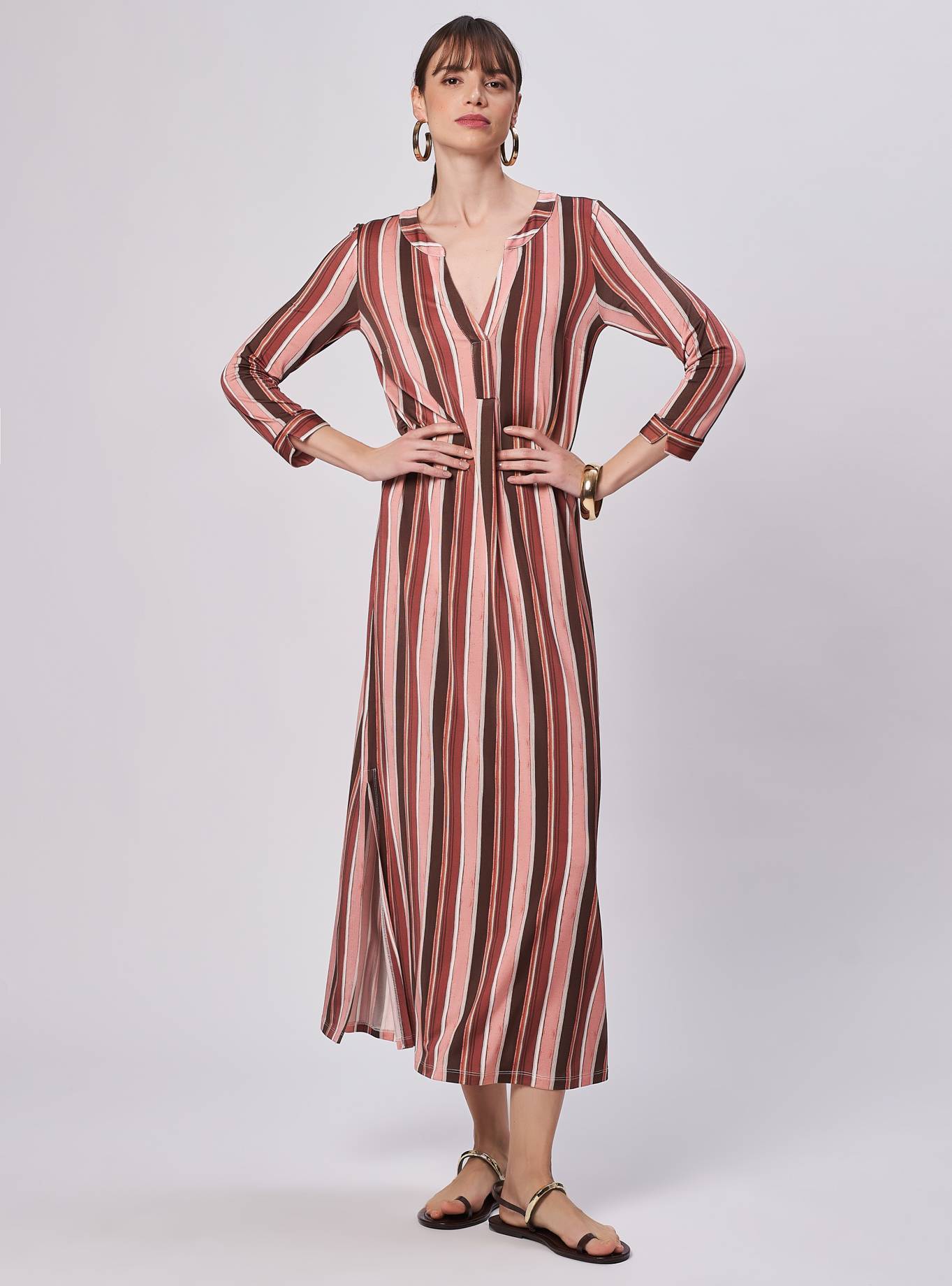 Abito lungo in jersey, scollo femminile. Maniche 3/4. Linea dritta, piega davanti per dare maggiore morbidezza. Spacchi laterali.