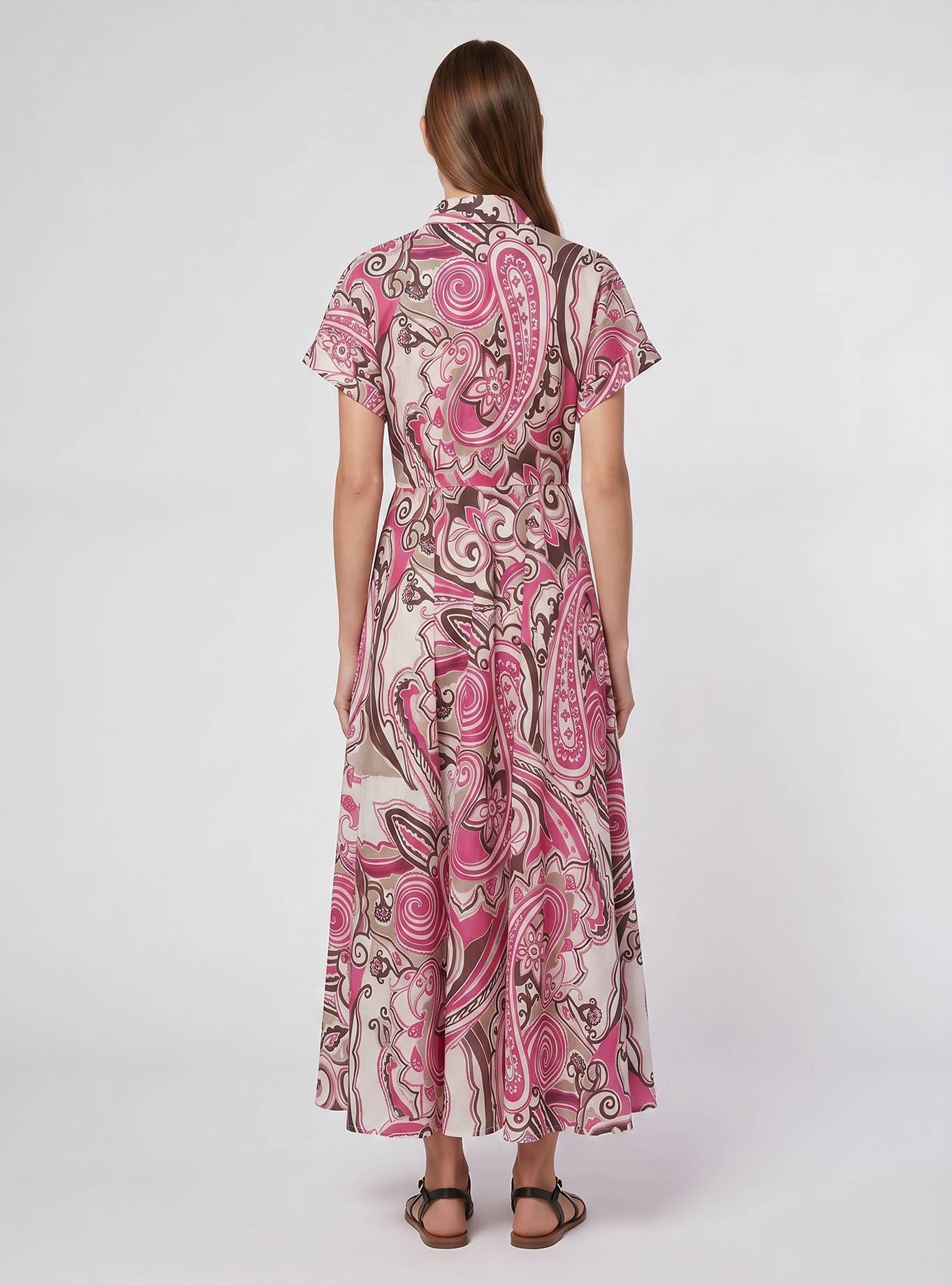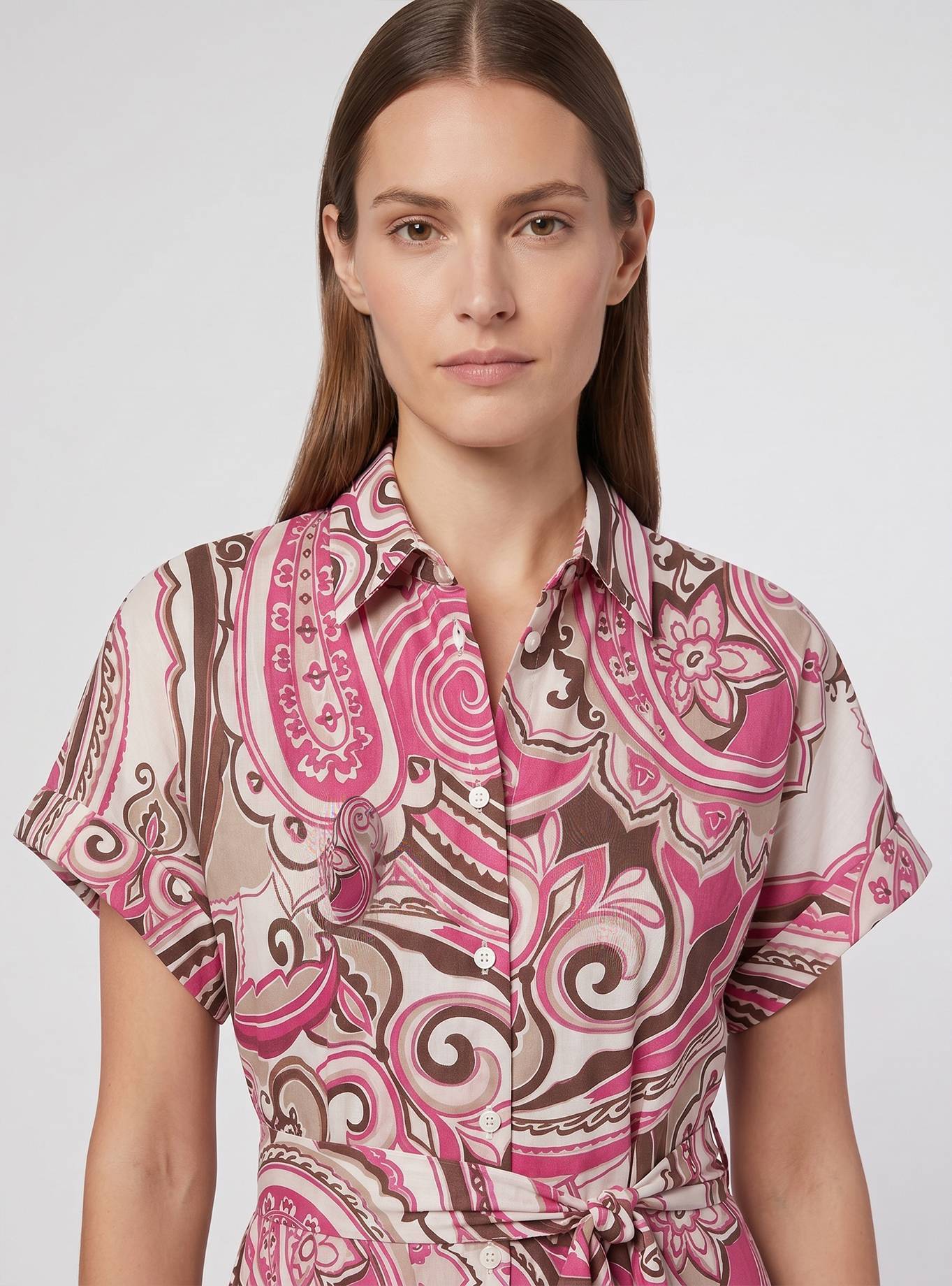 Abito lungo chemisier, vestibilità morbida nella parte alta, con ampia svasatura al fondo. Manica corta a kimono con risvolto. Tasche inserite nel fianco. Cintura abbinata. Abito lungo.