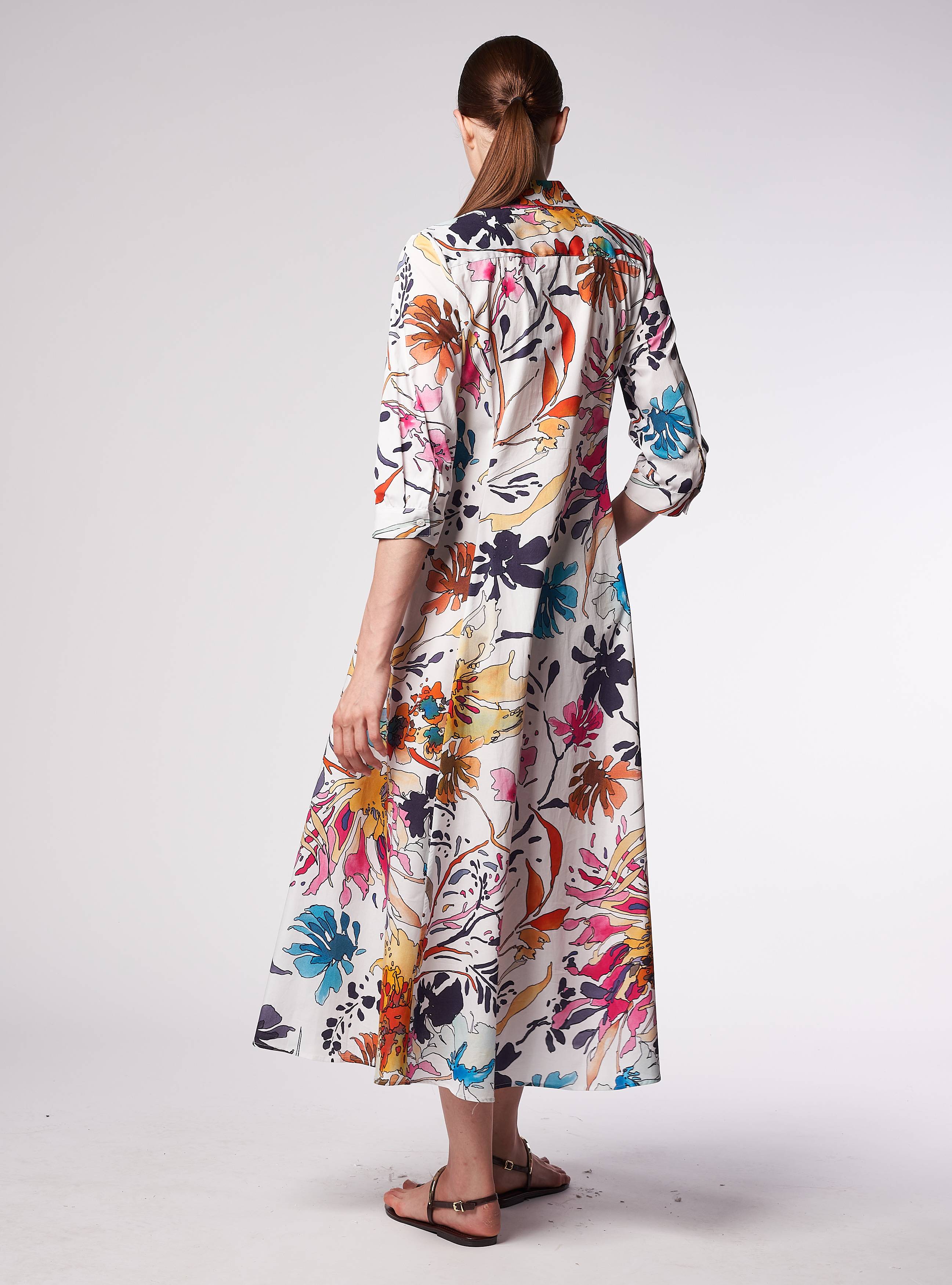 Abito lungo chemisier. Collo a camicia, scollatura a "V". Morbido in vita e ampio all'orlo, tagli verticali. Manica 3/4 corto con polsino un bottone. Abito lungo. Cintura nello stesso tessuto da annodare per sottolineare il punto vita.
