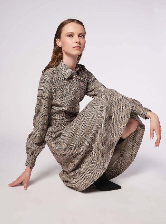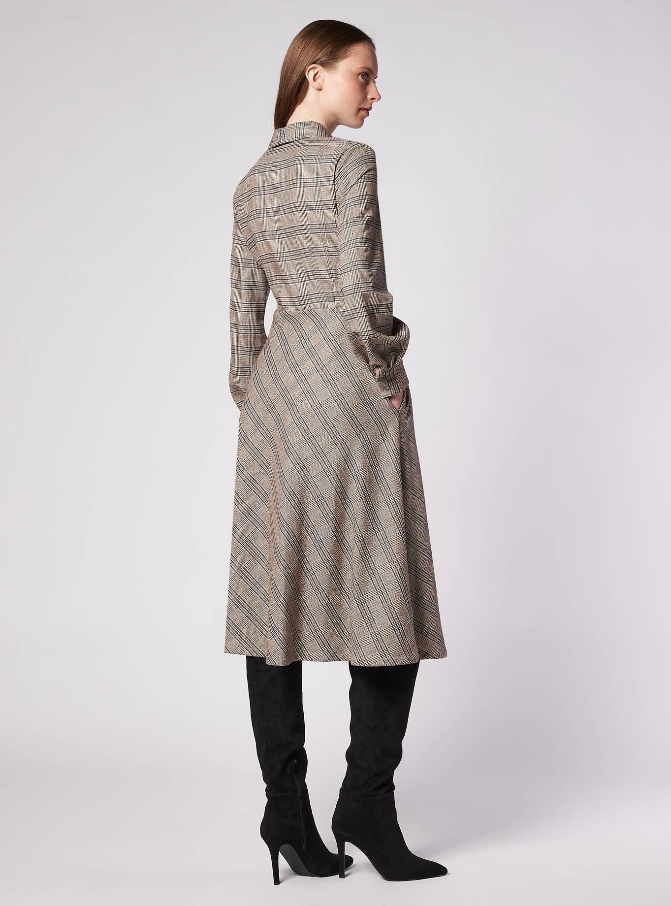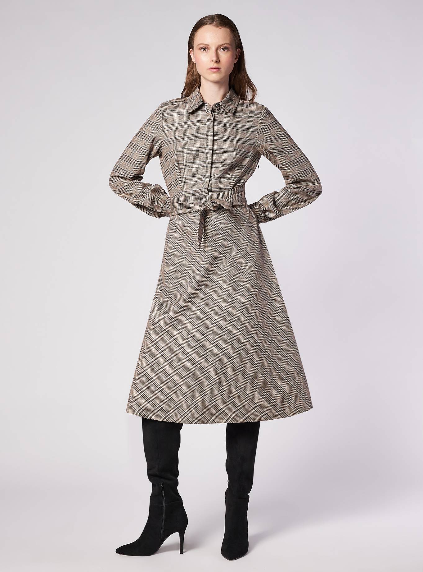 Abito chemisier, vestibilità regolare con taglio in vita e ampia svasatura al fondo. Spalla regolare, manica con leggero sbuffo al fondo, polso a due bottoni. Collo a camicia, allacciatura all'inglese. Cintura abbinata da annodare per sottolineare il punto vita. Carrè nel dietro. Tasche inserite nel fianco. Lunghezza midi.