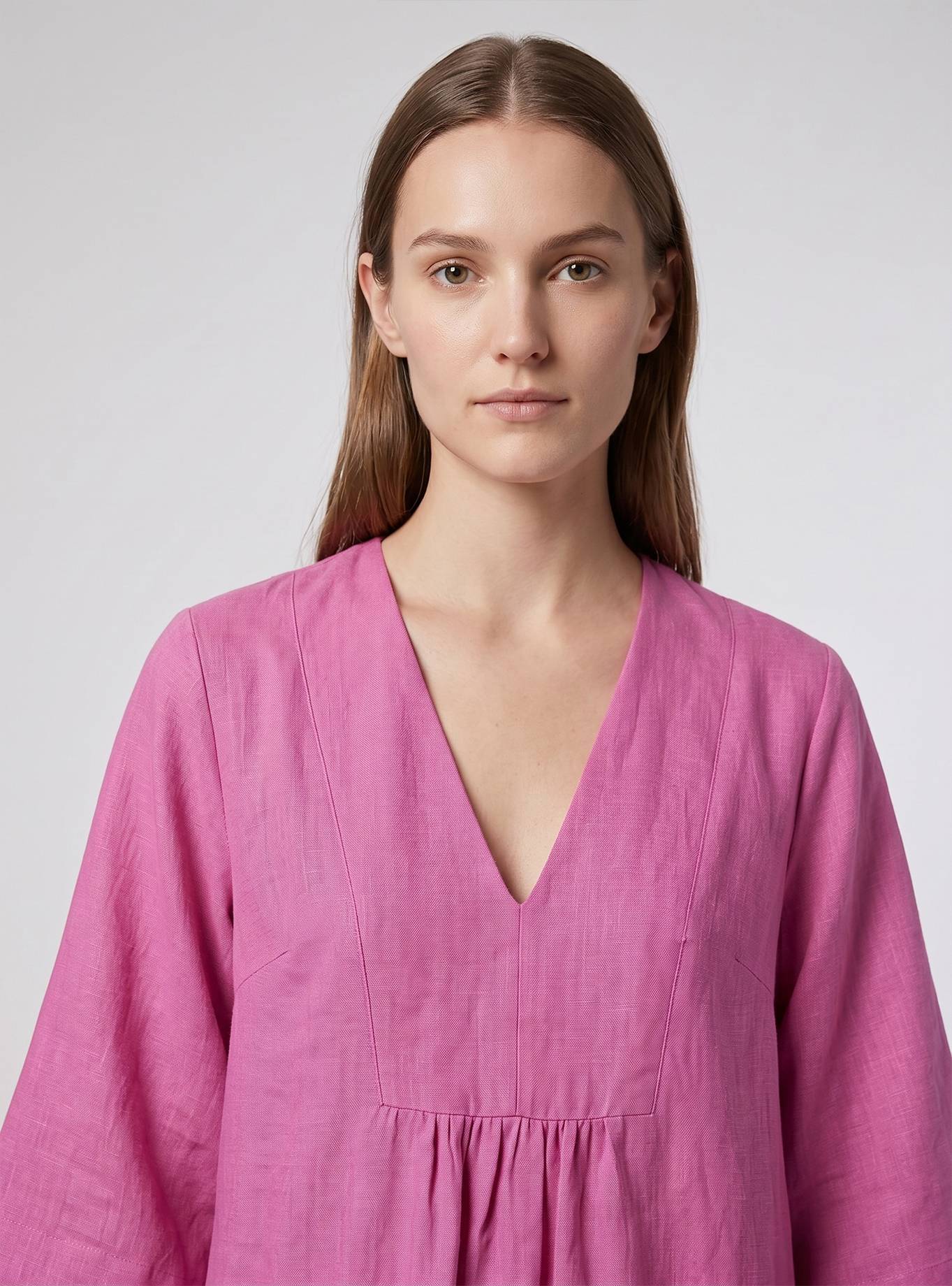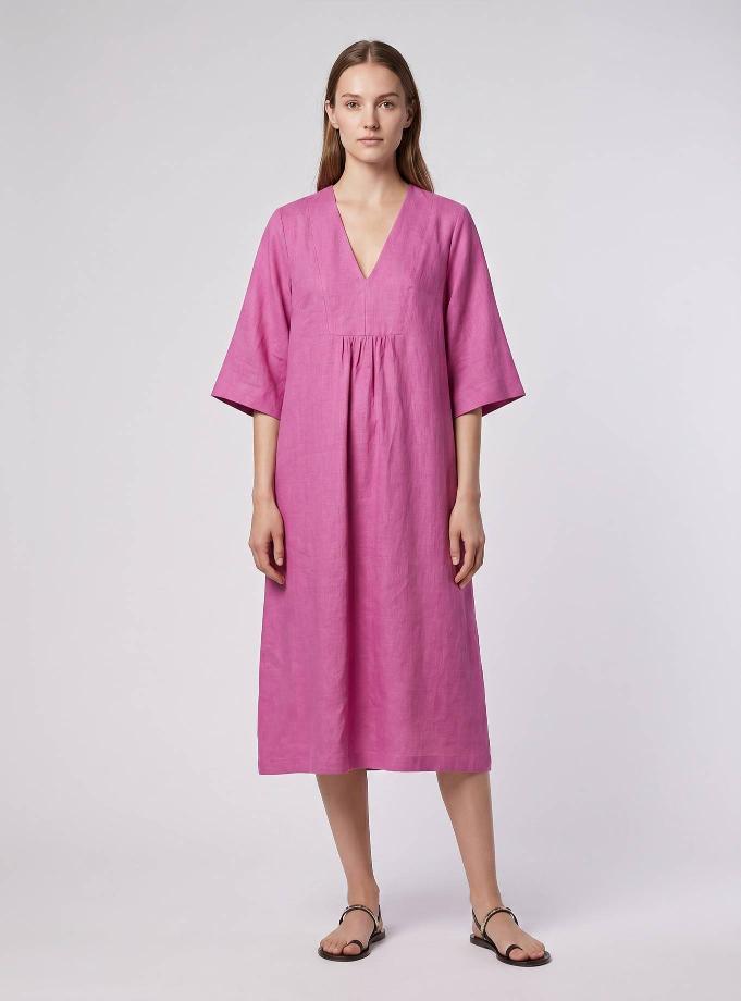 Abito kaftano, lunghezza midi, vestibilità morbida, maniche svasate al gomito. Scollo a "V" femminile con pettorina e motivo di arriccio. Tasche inserite nei fianchi.