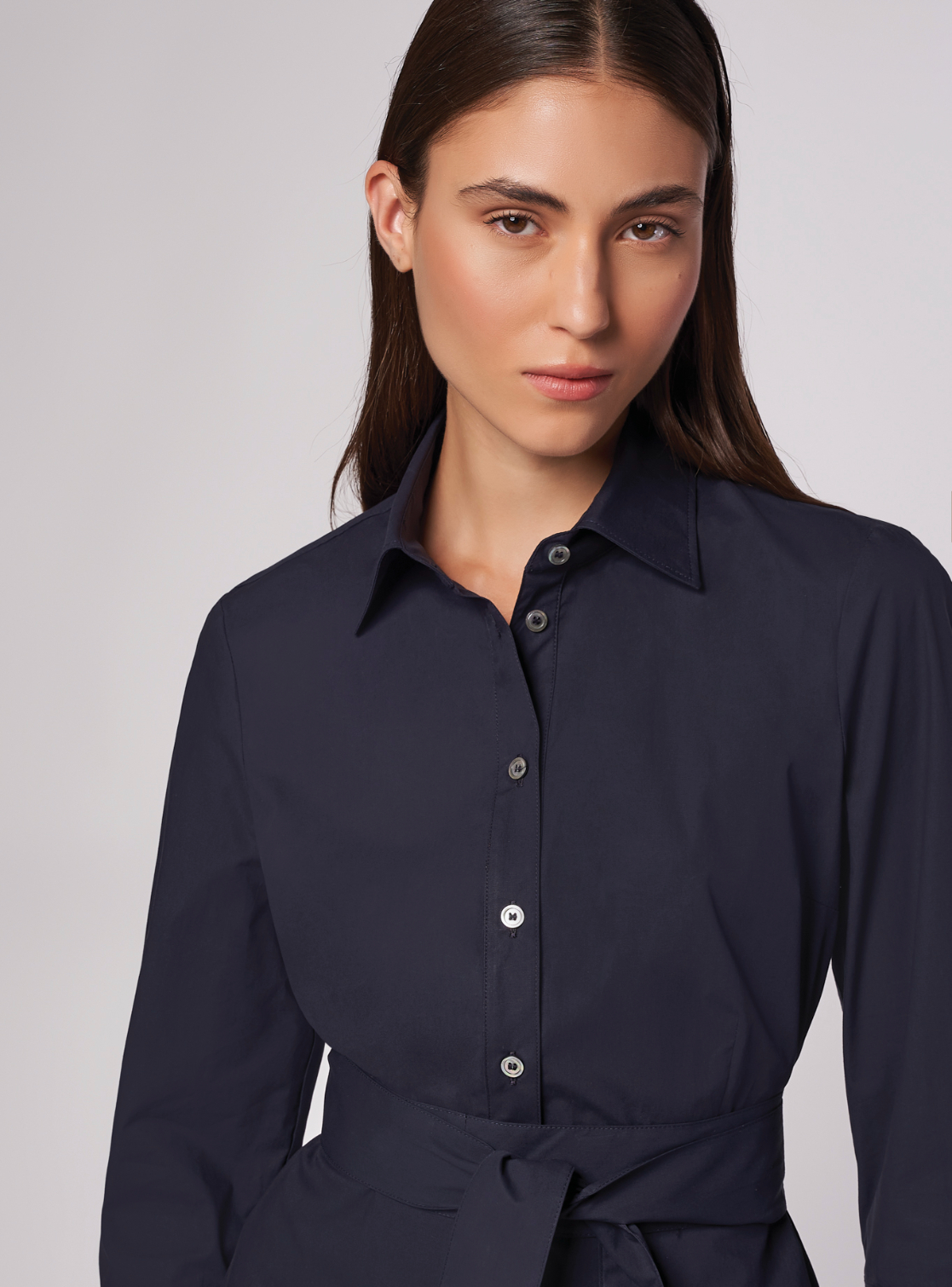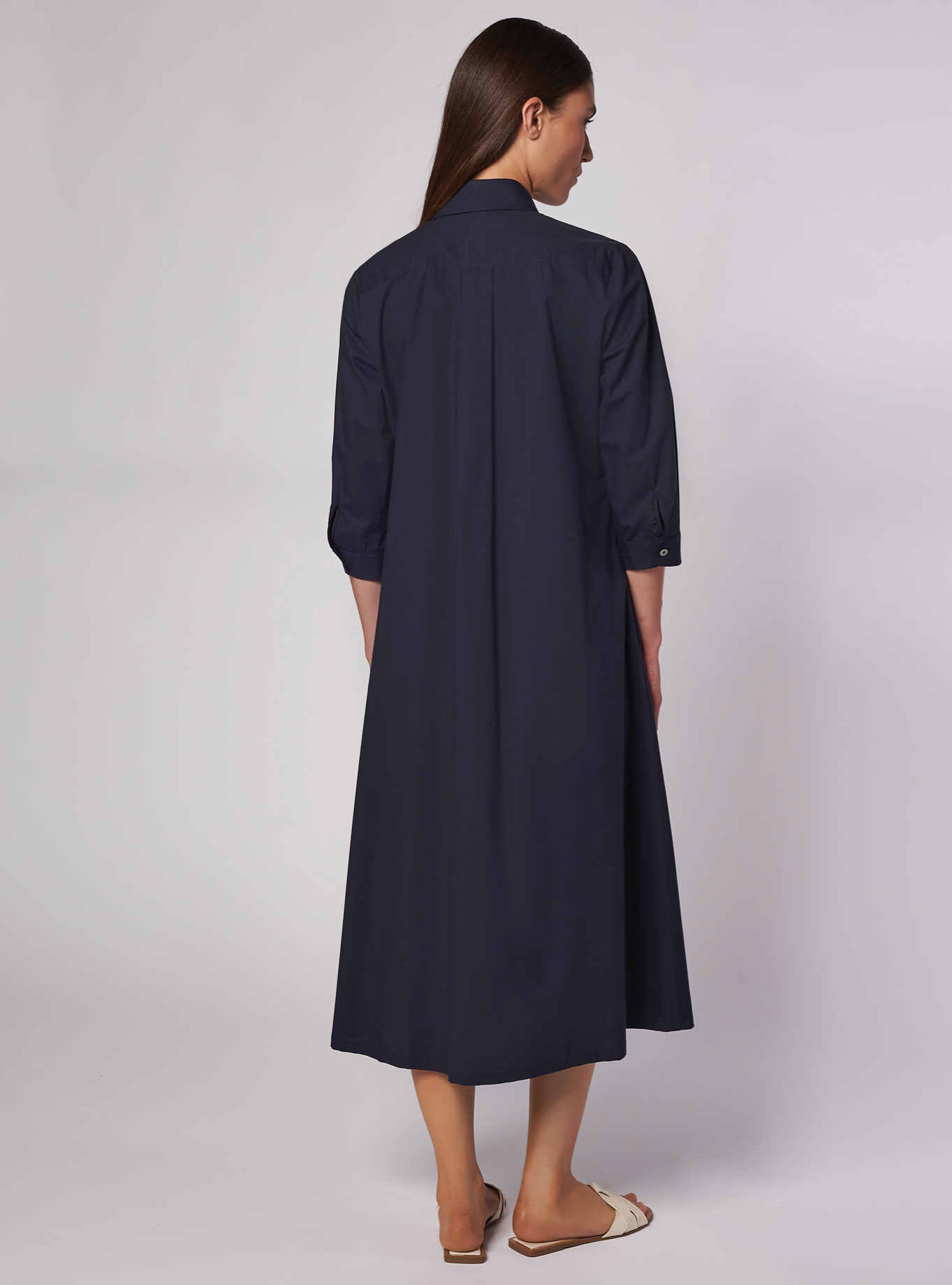 Abito chemisier, vestibilità leggermente aderente nella parte superiore e ampia svasatura a ruota nella parte inferiore. Collo a camicia con scollatura a "V".