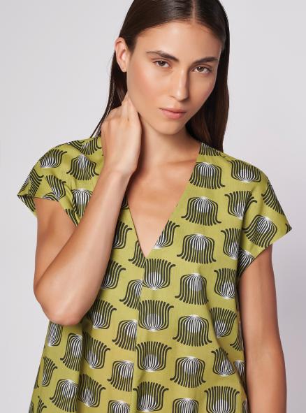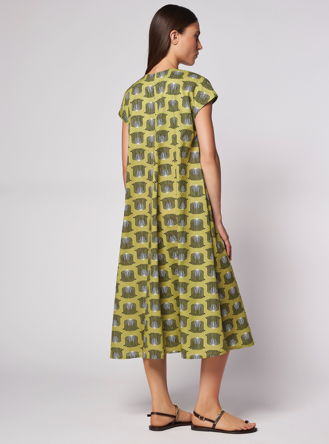 Abito midi, maniche corte a kimono, scollo a "V" femminile. Torace morbido, ampia svasatura a ruota al fondo.