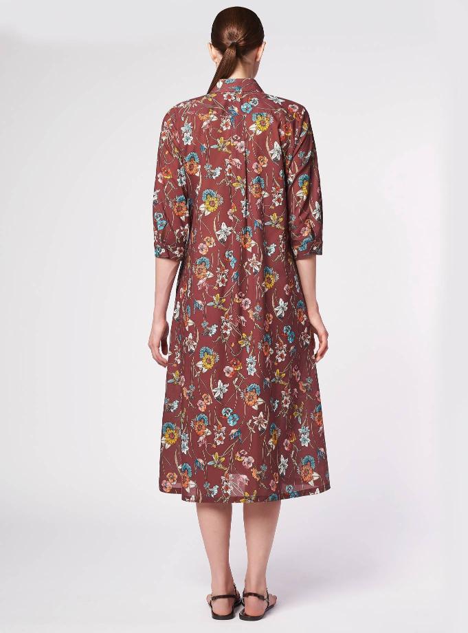 Abito chemisier, vestibilità leggermente aderente nella parte superiore e ampia svasatura a ruota nella parte inferiore. Collo a camicia con scollatura a "V".