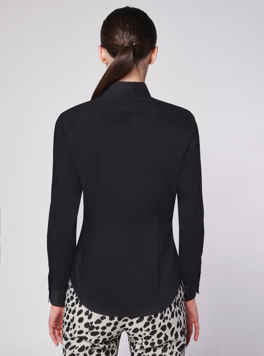 Camicia vestibilità aderente. Collo camicia. Manica regolare con polso due bottoni. Pinces davanti e dietro- Carrè dietro. Camicia medio corta, lunghezza fianco medio alto.