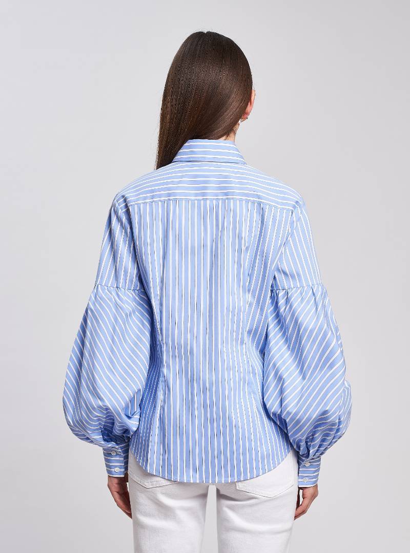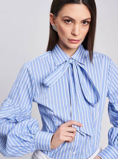 Camicia vestibilità aderente. Collo a camicia con fiocco staccabile da annodare. Spalla regolare, manica femminile che si allarga fino all'attaccatura polso creando un effetto balloon. Polso, con due bottoni. Pince davanti e dietro. Carrè sul dietro. Camicia medio corta, lunghezza fianco medio alto.
