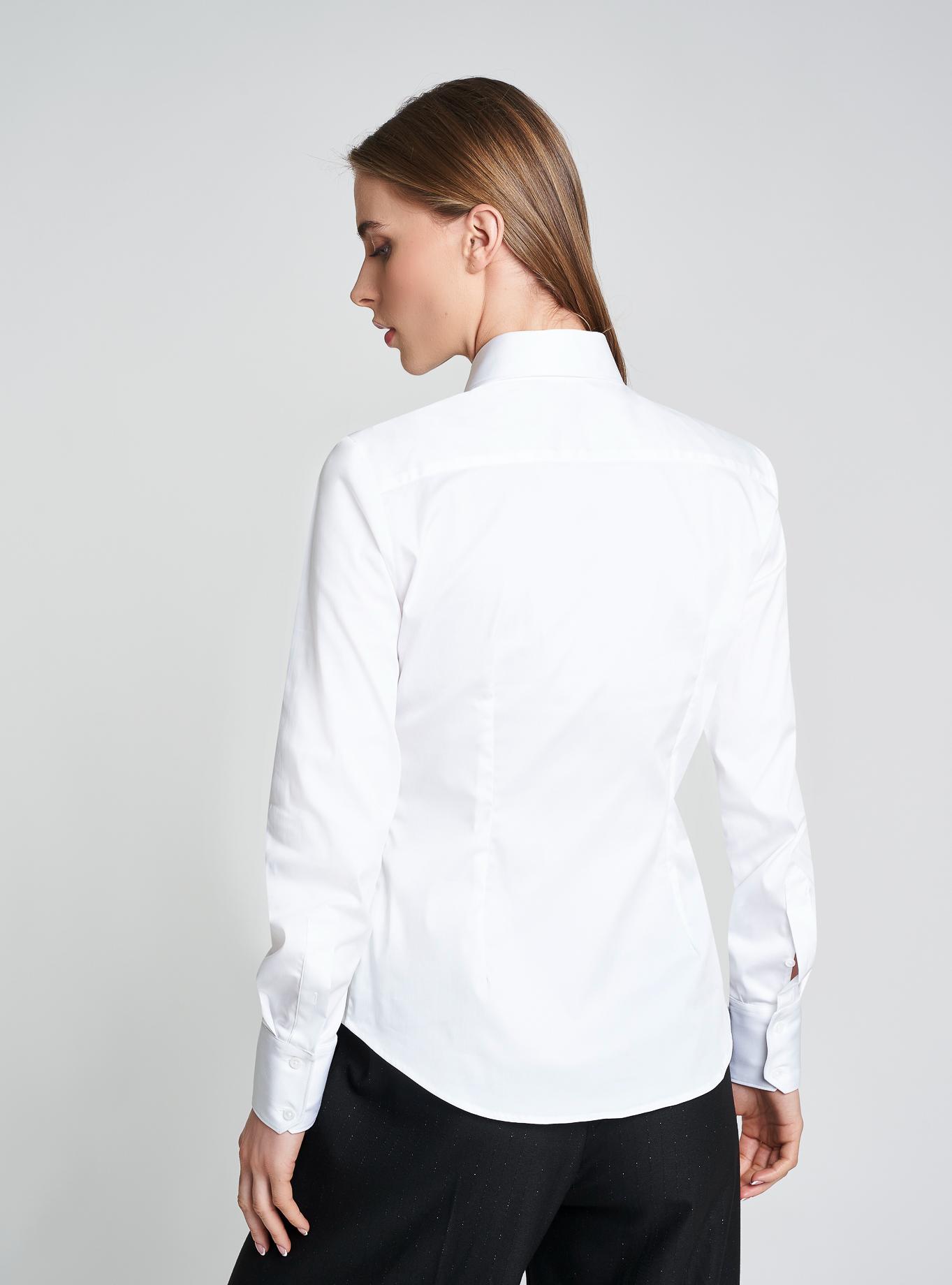 Camicia vestibilità aderente. Collo camicia. Manica regolare con polso due bottoni e fessino. Pince davanti e dietro. Carrè sul dietro. Camicia medio corta, lunghezza fianco medio alto.
