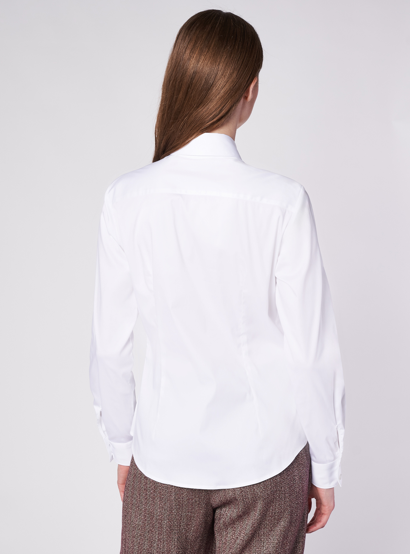 Camicia vestibilità aderente. Collo camicia. Manica regolare con polso due bottoni. Pinces davanti e dietro- Carrè dietro. Camicia medio corta, lunghezza fianco medio alto.