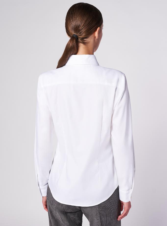 Camicia vestibilità aderente. Collo camicia. Manica regolare con polso due bottoni. Pinces davanti e dietro- Carrè dietro. Camicia medio corta, lunghezza fianco medio alto.