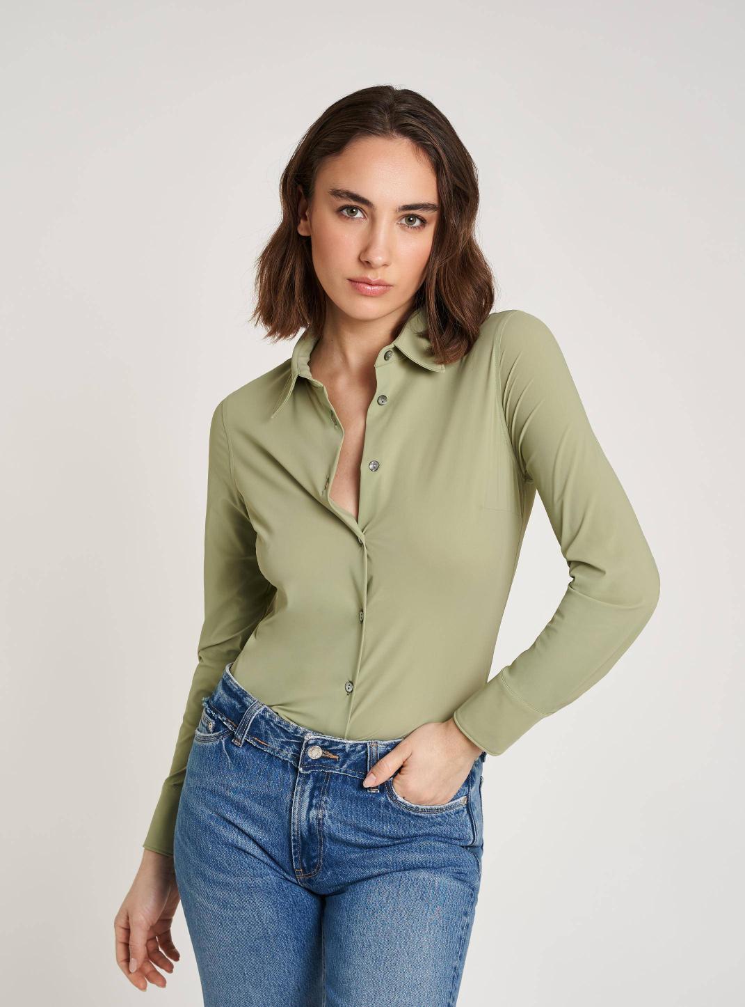 Camicia vestibilità aderente. Collo a camicia. Manica regolare, polso un bottone. Pinces sul dietro. Camicia medio corta, lunghezza fianco medio corto.
