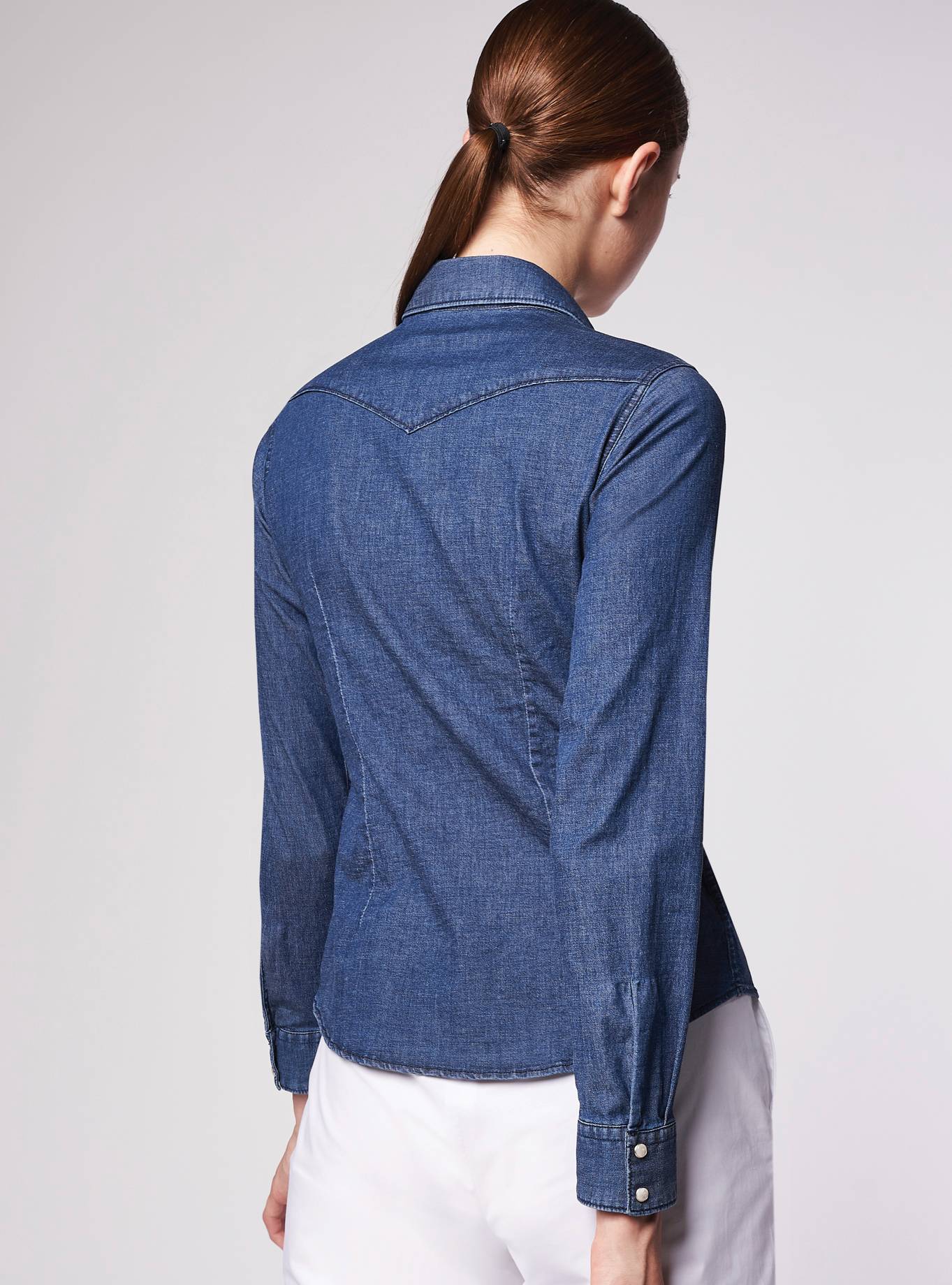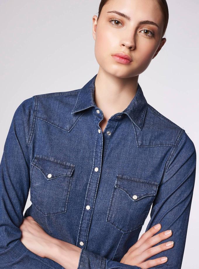 Camicia texana vestibilità aderente, caratterizzata dalle tasche con patta. Collo a camicia. Pinces davanti e dietro.
