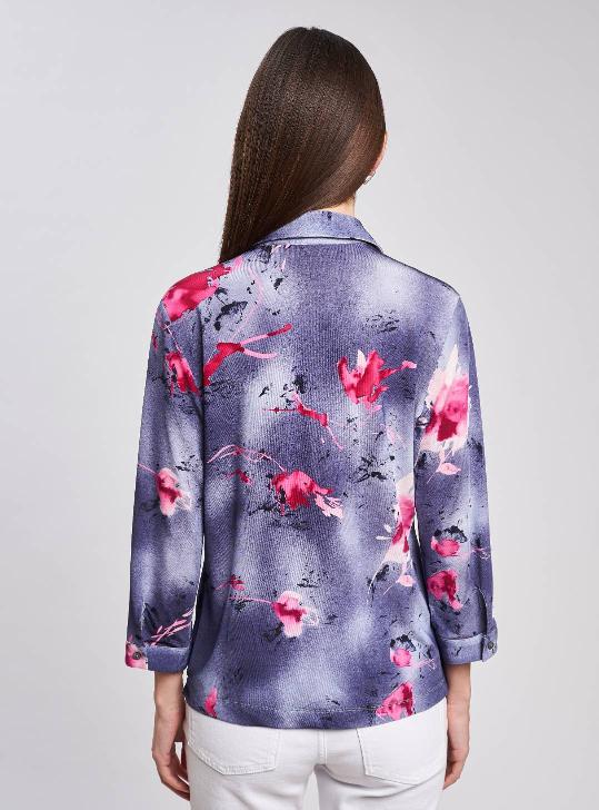 Polo vestibilità morbida. Collo a camicia, scollo a "V" femminile, manica regolare lunghezza 3/4 con polsino e spacchetto laterale, pari al fondo. Lunghezza fianco alto.