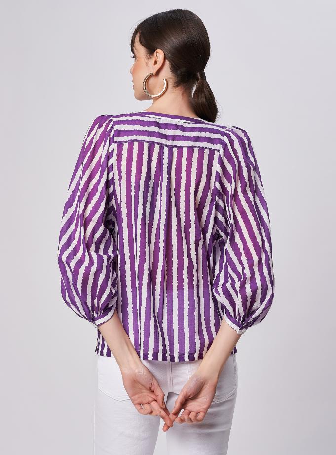 Camicia dalla vestibilità regolare. Scollo a "V" con cinturino rotondo piatto alla coreana. Spalla leggermente arricciata e manica ampia a sbuffo 3/4 corto con polsino basso e un bottone. Carrè dietro con cannoncino. Lunghezza fianco.