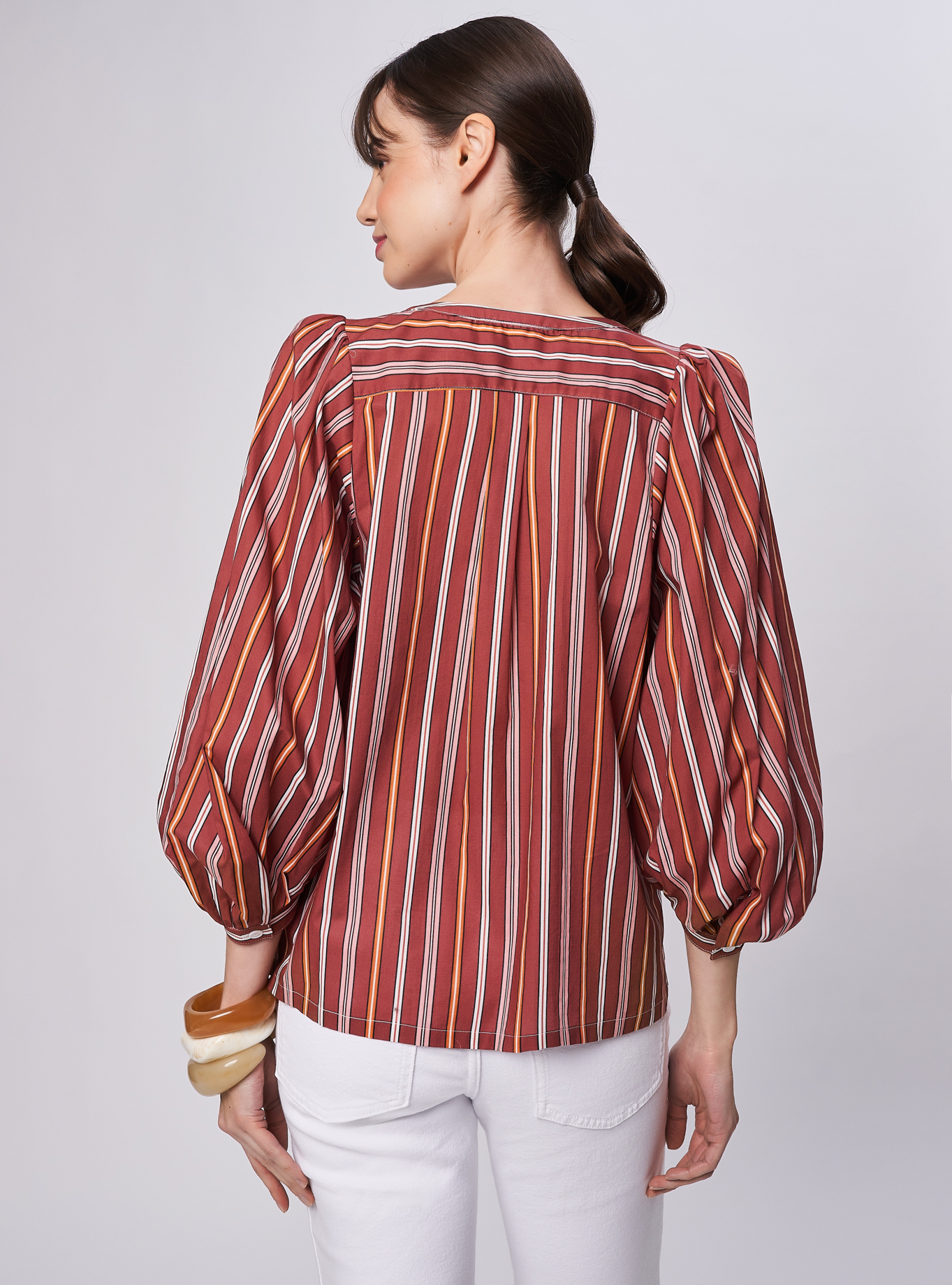 Camicia dalla vestibilità regolare. Scollo a "V" con cinturino rotondo piatto alla coreana. Spalla leggermente arricciata e manica ampia a sbuffo 3/4 corto con polsino basso e un bottone. Carrè dietro con cannoncino. Lunghezza fianco.