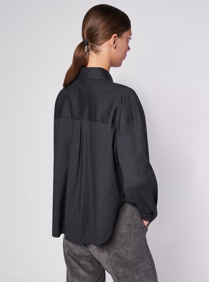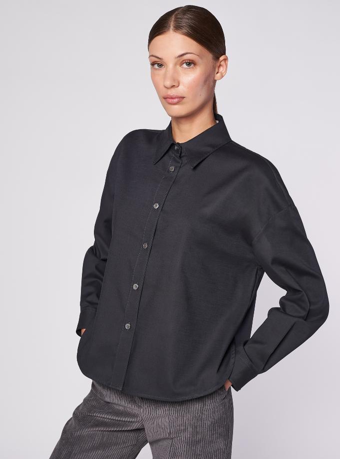 Camicia vestibilità morbida. Collo a camicia. Spalla scesa con giro basso, manica morbida con polsino un bottone. Carrè dietro con cannoncino. Camicia corta, Lunghezza fianco alto con spacchetti.