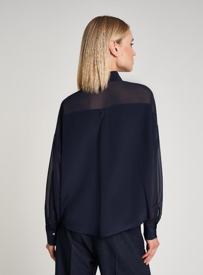 Camicia vestibilità morbida. Collo a camicia. Spalla scesa, manica lunga con polso e due bottoni. Abbottonatura nascosta, tasca applicata, motivo di taglio spalla che scende sul davanti . Carrè dietro con cannoncino, orlo stondato, lunghezza fianco medio basso. Maniche e carrè in tessuto trasparente in tono.
